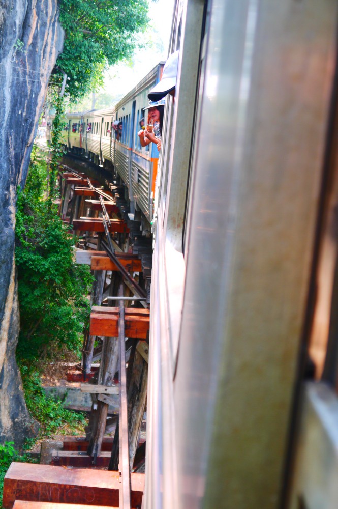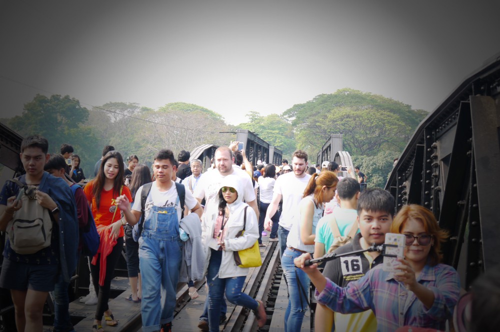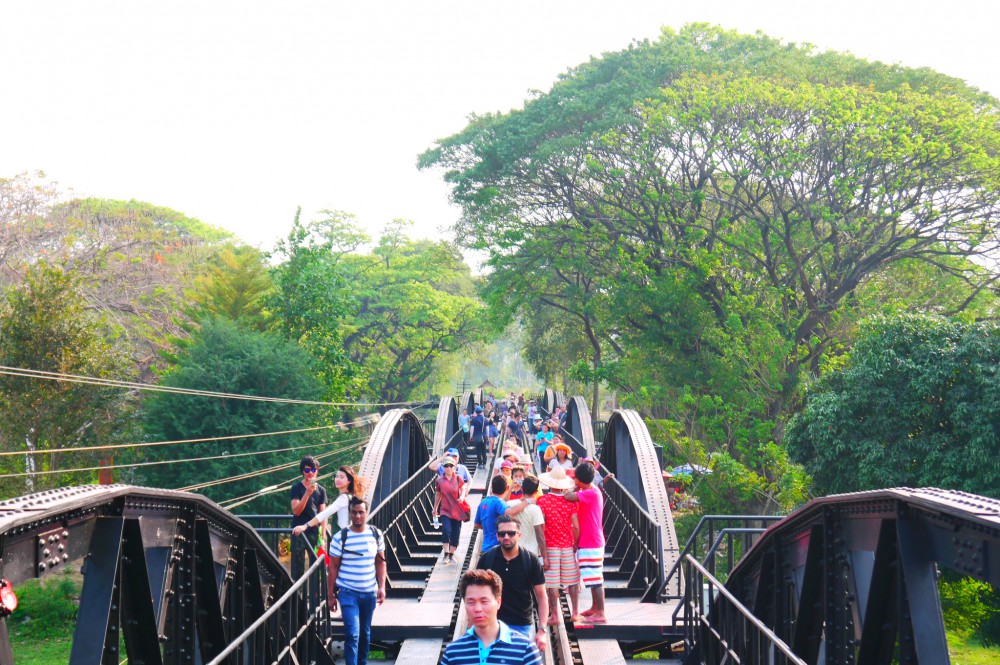 ประมาณ 11 โมงเราก็ถึงสะพานข้ามแม่น้ำแคว คนเยอะมากๆ ทุกคนมาพร้อมกันโดยมิได้นัดหมาย ค่อนข้างวุ่นวายจอแจทีเดียว โดยรถไฟจะจอดให้เราถ่ายรูปได้ 15 นาที