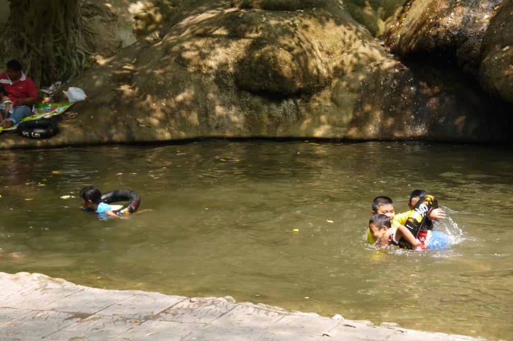 แม้ก้าวลงรถไฟเท้าไม่ได้จุ่มน้ำจ๋อมขนาดที่ว่า แต่ก็ส่งถึงที่เลย เดินไปหน่อยก็ถึงน้ำตกไทรโยกน้อย แต่ช่วงที่เราไปน้ำค่อนข้างน้อยแล้ว
