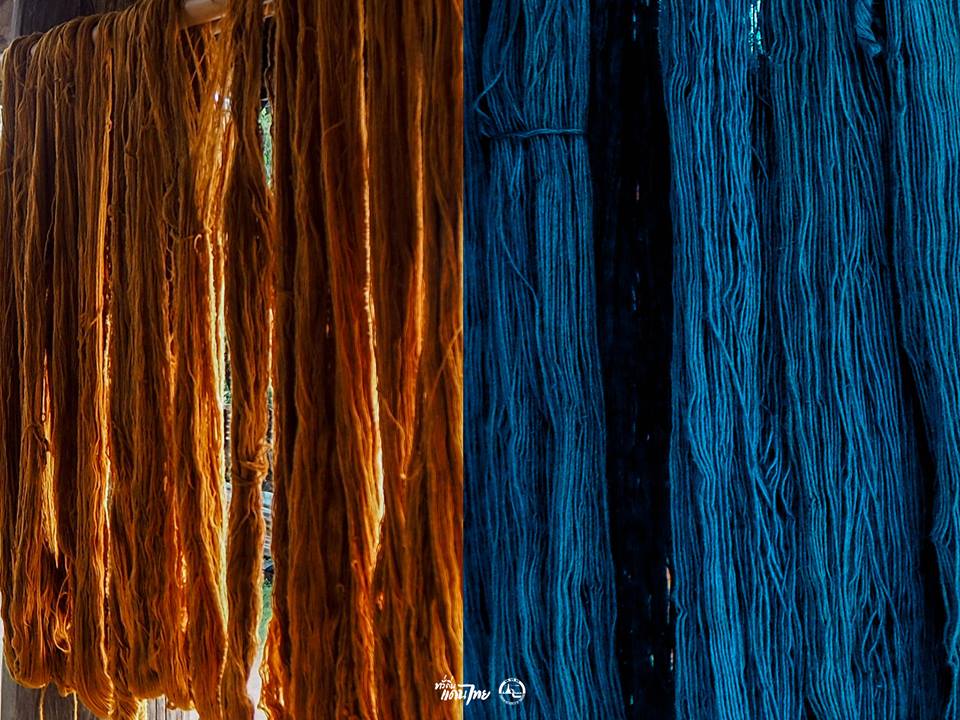 เส้นไหมจากการย้อมสีธรรมชาติ ไหมสีเหลืองได้จากแก่นแข ส่วนไหมสีน้ำเงิน