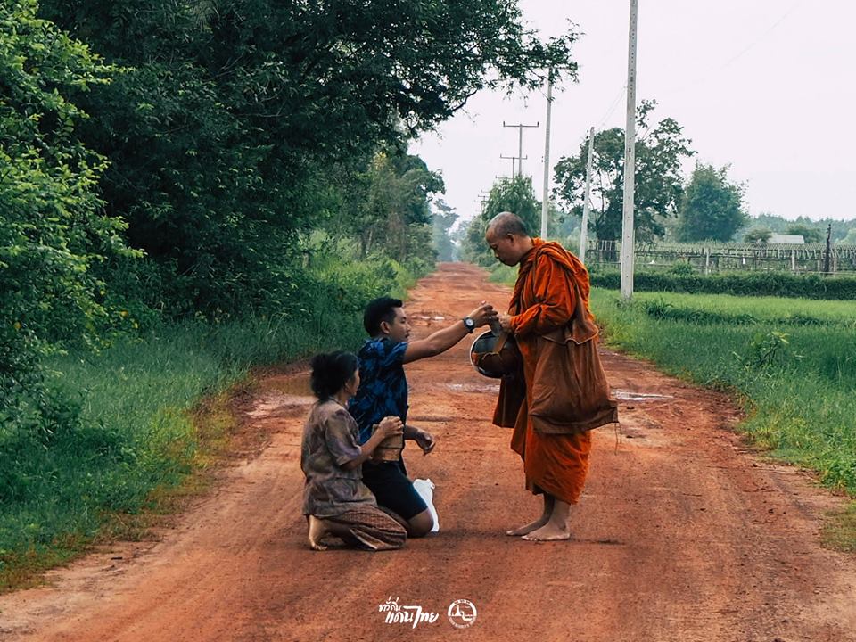 ชาวบ้านที่นี่ตื่นมารอใส่บาตรกันตั้งแต่เช้า ตลอดสองข้างทางเลยค่ะ พี่เม่น เลยแวะร่วมใส่บาตรกับแม่ ๆ ด้วยเลย อิ่มบุญกันไปถ้วนหน้าเลยค่ะ