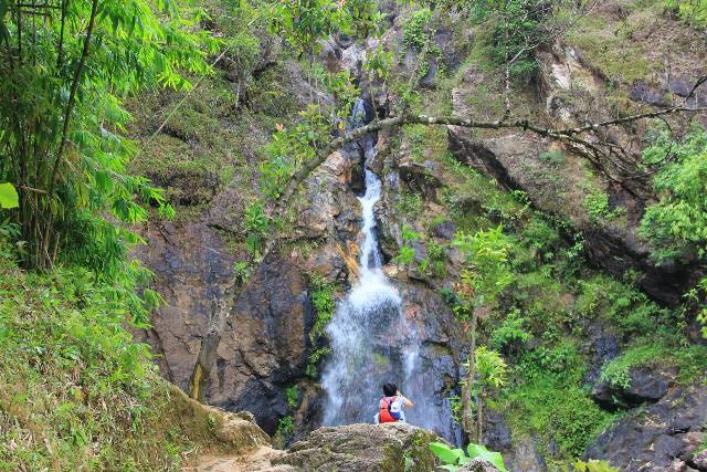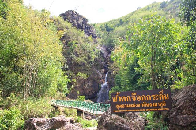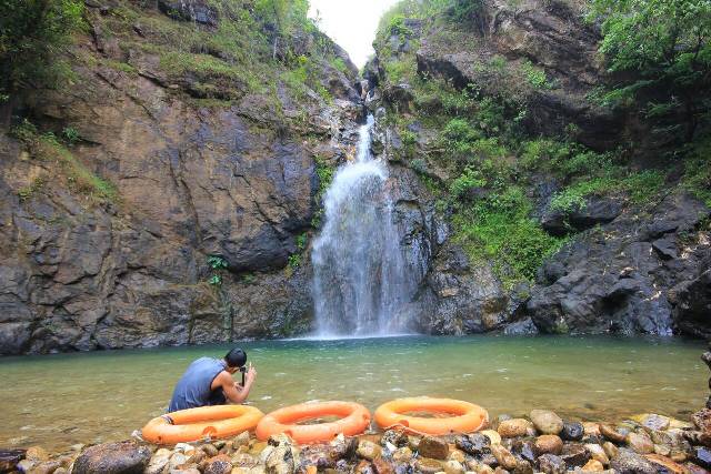 จากเนินช้างศึก นายสีนิลพามาเล่นน้ำตก ไกด์บอกว่าน้ำตกที่นี่มีน้ำตลอดทั้งปีมากน้อยตามปริมาณน้ำฝน สังเกตดีๆ จะเห็นว่าน้ำที่นี่เป็นสีเขียวอมฟ้า ด้วยความรู้ที่มีมารู้มาว่าน้ำสีแบบนี้เป็นแหล่งที่ดีมากๆ แน่นอนซิคับก็น้ำที่นี่เป็นน้ำแร่ เจ้านายของสีนิลคงตัวขาวแล้วล่ะได้อาบน้ำแร่เชียวนะ..คริๆ
