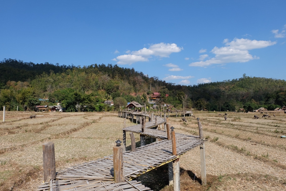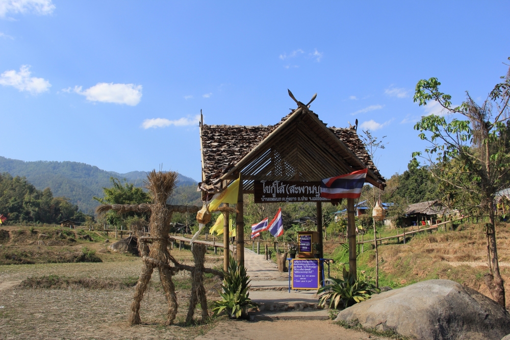 ออกจากตัวเมืองปาย ไปตามถนน 1095 สักพักจะเจอทางแยกเพื่อไป "สะพานบุญโขกู้โส่" บ้านแพมบก อ.ปาย (อันนี้เราแวะก่อนเดินทางไปบ้านวัดจันทร์) ระหว่างทางก็จะผ่านหมู่บ้าน ผ่าน "น้ำตกแพมบก" สถานที่ยอดฮิตที่ นทท. ชาวต่างชาติชอบมาเที่ยวกัน ซึ่งเป็นน้ำตกเล็กๆ