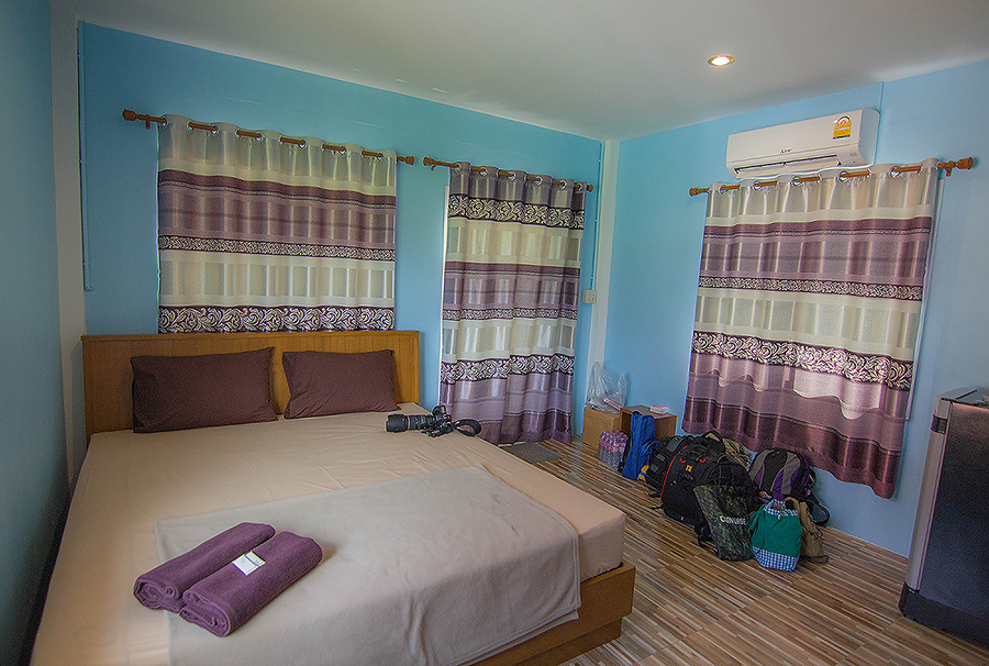 ในตอนแรกที่วางแผนไว้ อยากพักใน ศรีปากประ รีสอร์ท เพราะหวังจะออกมาถ่ายภาพสะดวกๆ แต่ที่พักเต็มหมด เป็นโชคดีของเราไป เพราะได้ประหยัดเงินในส่วนนี้ เอาไว้จ่ายค่าเรือพาเที่ยว คลองปากประ – ทะเลน้อย  จึงไปได้ที่พักอีกแห่งหนึ่ง ซึ่งอยู่ไม่ไกลจากคลองปากประมากนัก ชื่อ สายคลอง สองเล รีสอร์ท  สิ่งอำนวยความสะดวกมีครบ (แอร์ ทีวี ตู้เย็น เครื่องทำน้ำอุ่น แต่ยังไม่มี Wifi  ห้องพักราคา 1,000 บาท )