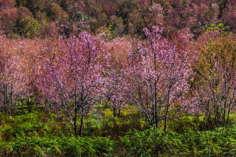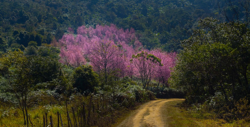 จากนั้นนั่งรถอ้อมมายัง check point ของภูลมโล เราจะเห็นยอดภูลมโลอยู่อีกฝั่งพร้อมแนวต้นนางพญาเสือโคร่งสีชมพูหวานแหว๋ว น่ารักจริงๆ