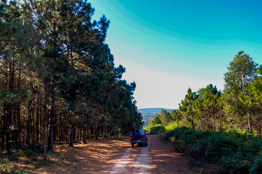 หลังจากนั่งเขย่า เอียงซ้าย เอียงขวาพร้อมกับซึมซับละอองฝุ่นซักพัก เราก็ได้เจอแนวป่าสนที่สมบูรณ์มาก