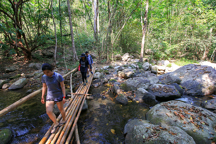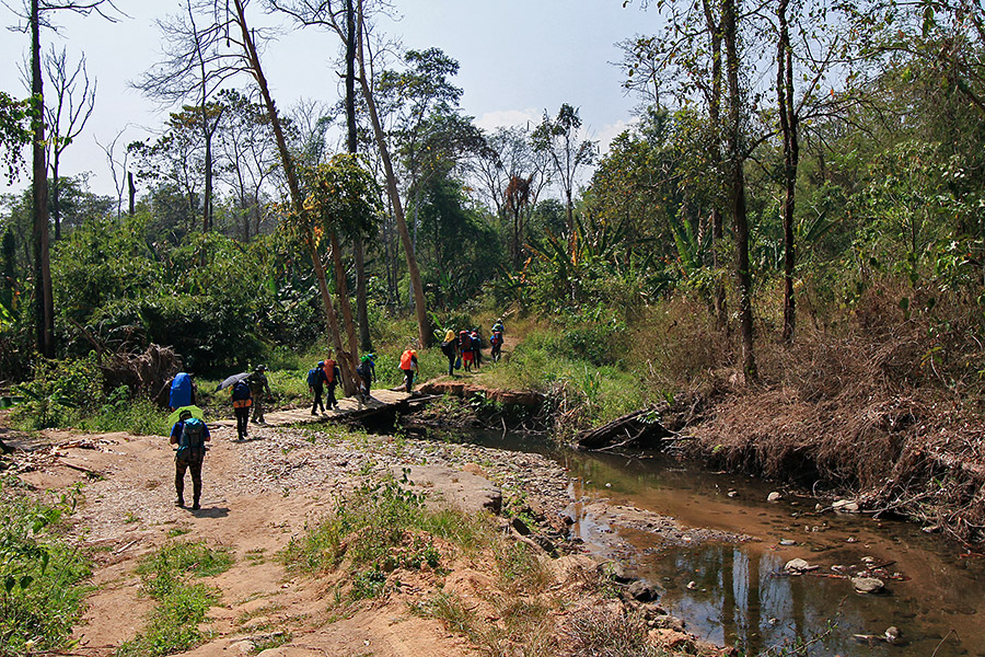 หลังพ้นเนินแรกมาอย่างสะบักสะบอม จากนั้นทางค่อนจะราบ มีเนินสลับอยู่บ้างแต่ไม่ชันมาก เดินเรื่อยๆ ตากแดดเหนื่อยก็พัก มีธารน้ำห้วยมะนาวที่เราต้องข้ามไปข้ามมาหลายรอบ ใครมีเครื่องกรองน้ำพกพาก็ค่อนข้างสบาย เติมน้ำได้ตลอดในช่วงนี้