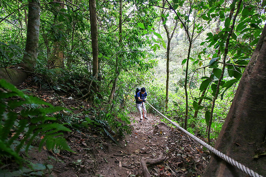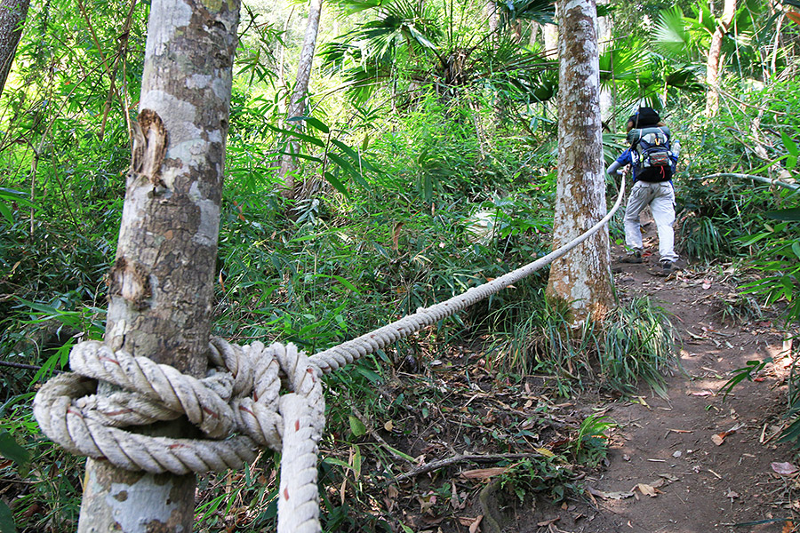 เหงื่อหยดติ๋งๆ ไปกี่ร้อยกี่พันเม็ดแล้วก็ไม่รู้ สิบโมงผมมาถึงจุดที่เรียกว่าเชือกหนึ่ง คือจุดที่มีเชือกไว้คอยพยุงให้เดินขึ้นเป็นจุดแรก