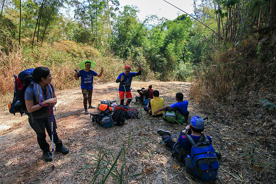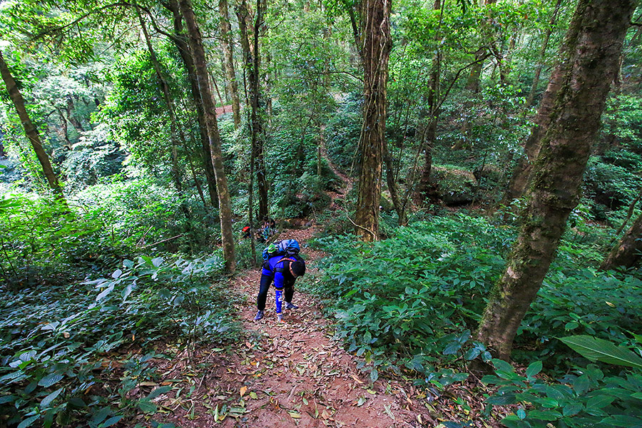 ทั้งสองกลุ่มเดินไล่ไปพร้อมกัน มีเจ้าหน้าที่ดูแลรวมกันสี่คน เฉพาะกลุ่มเรามีลูกหาบสามคน แบกคนละ20 กิโลกรัม แต่เพราะแม่ครัวเตรียมของกินกันหรูหรานิดหน่อยน้ำหนักเลยทะลัก ก็เป็นหน้าที่ของผู้ชายล่ะครับต้องเฉลี่ยกันมาทำให้น้ำหนักแบกหน่วงหน่อยๆ