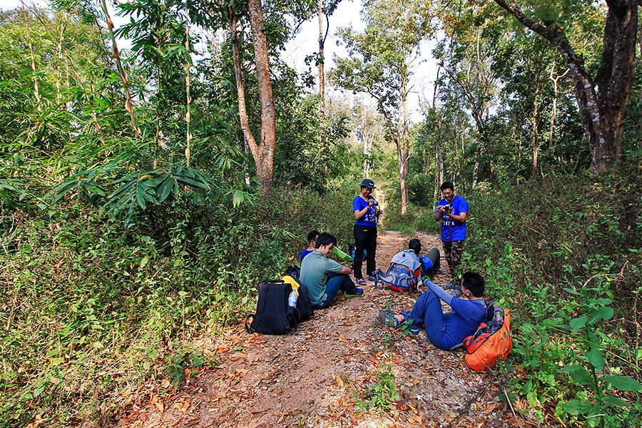 วันสุดท้ายของการเดินทางกับอีก 16 กม. ที่แค่คิดก็เหนื่อยแล้ว ตอนแรกตามแผนที่ตกลงกันไว้คือเจ้าหน้าที่บอกว่าเราควรออกตั้งแต่เจ็ดโมงเช้าจะได้เลี่ยงความร้อนจากแดดเที่ยง แต่ก็ต้องปรับเปลี่ยนเพราะมีวิทยุแจ้งมาว่าเจอรอยเท้ากับขี้ช้างสดๆ ตรงจุดระหว่างทางเดินกลับ หากออกเช้าไปอาจมีโอกาสเจอกับพวกมันซึ่งหน้า เลยต้องเลี่ยงออกตอนเก้าโมงแทน