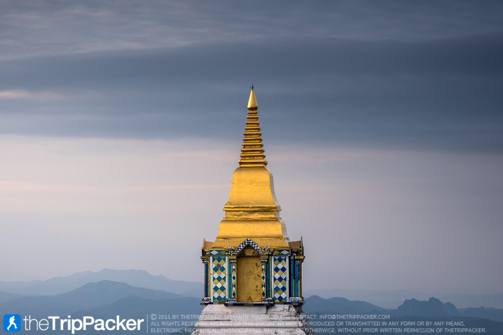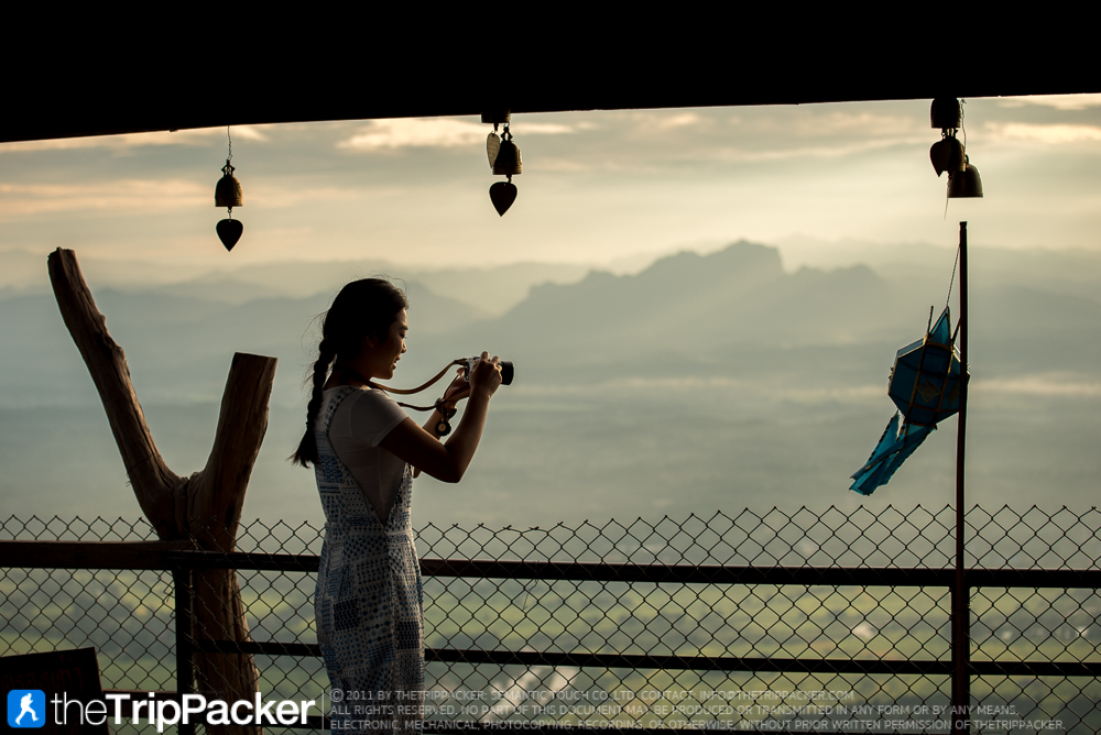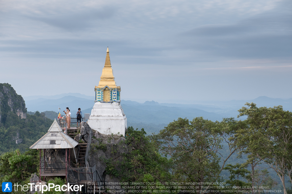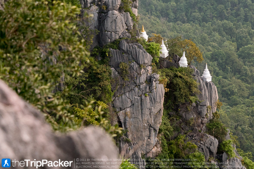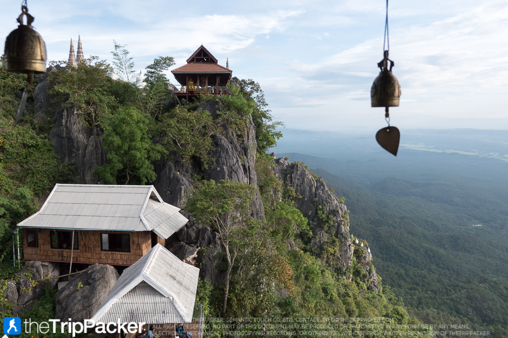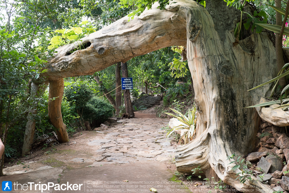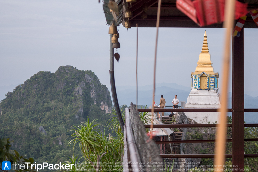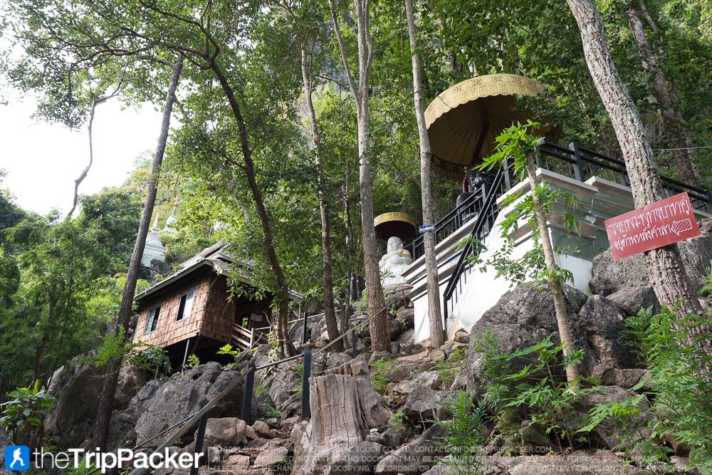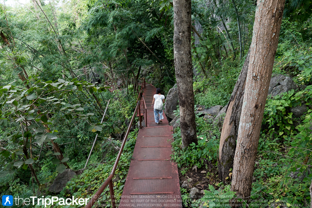 แวะกราบพระพุทธบาทเสร็จแล้ว ถึงคราวต้องออกแรงเดินขึ้นดอยไปสู่ชั้นบนสุด ลัดเลาะขึ้นไปตามภูเขาประมาณ 1 กิโลเมตร โดยทางวัดทำบันไดเหล็กให้เดินขึ้นได้อย่างสะดวก แต่สภาพเส้นทางที่ค่อนข้างชัน ค่อย ๆ เดินไป พักไป ก็จะดีที่สุด ระหว่างทางยังมีจุดชมวิวให้แวะพักให้หายเหนื่อย และแวะชมวิวสวย ๆ กันตลอดทาง หลังจากเดินจากที่ราบขึ้นที่สูงขึ้นเรื่อย ๆ ก็มีเหนื่อยหอบกันบ้าง แต่พอเหลือบไปเห็นป้ายว่าอีกนิดเดียวก็ถึงละก็ ทำให้เรามีแรงฮึดที่จะเดินต่อมาถึงยอดอย่างสบาย ใช้เวลาเดินประมาน 40-60 นาที (แล้วแต่ความฟิตของร่างกายแต่ละคน)