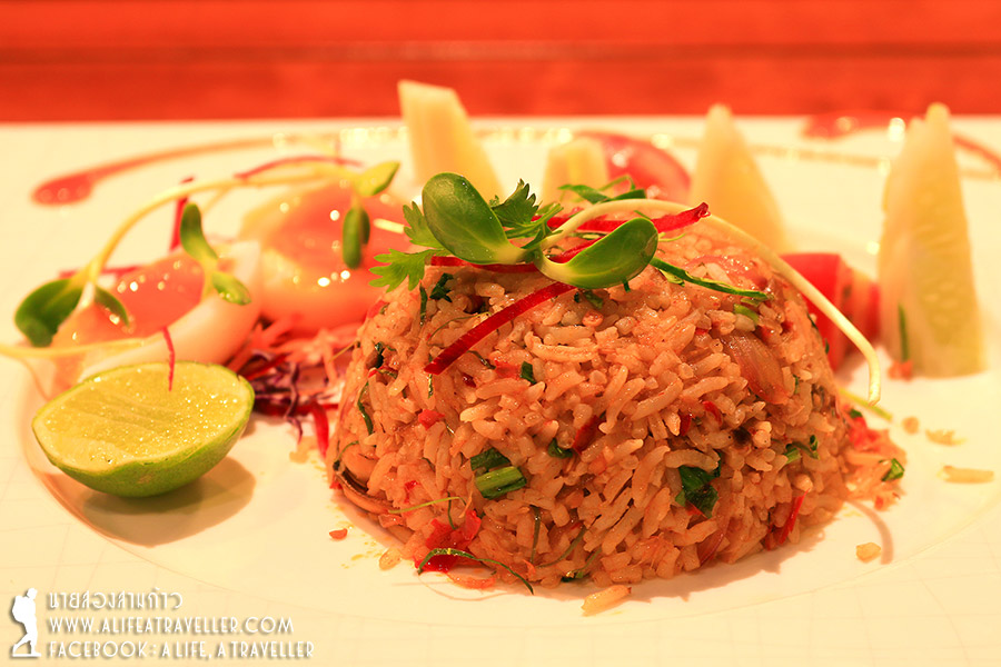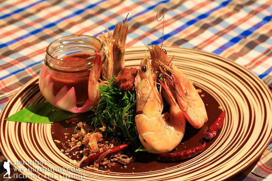 เมนูแนะนำของผมคือใบชะคราม ผักท้องถิ่นที่โตริมทะเล เป็นสมุนไพรสารพัดประโยชน์ มื้อแรกนี้มี ยำผักชะครามกุ้งสด แกงเผ็ดเป็ดย่าง แล้วก็ข้าวผัดสัปปะรด ทุกอย่างรสชาติถูกปาก