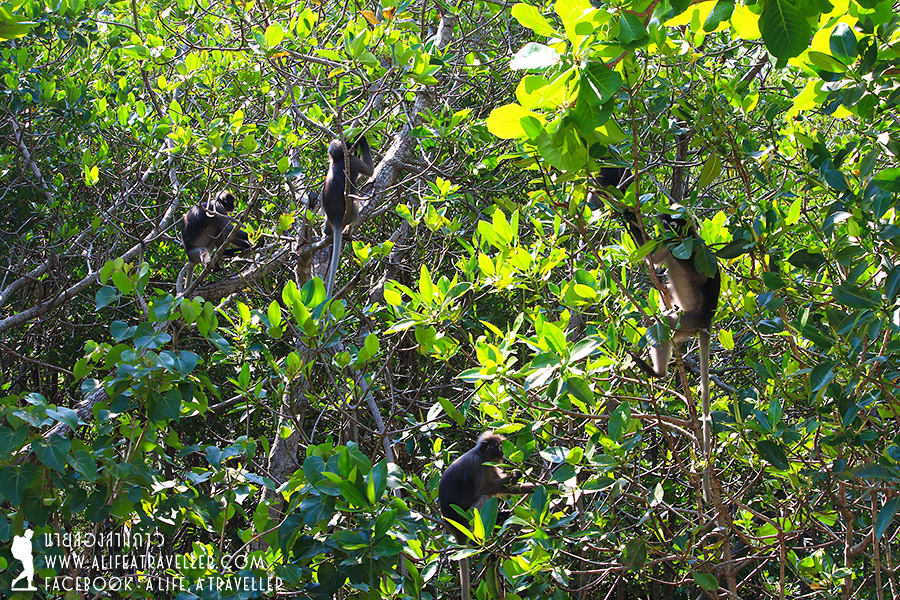 นั่งรถตู้มาสบายๆ อันดับแรกแวะที่ทำการอุทยานฯ เพื่อจ่ายค่าธรรมเนียม นักท่องเที่ยวคนละ 40 บาท โชคดีเจอฝูงคางแว่นถิ่นใต้ลงมาวิ่งเล่นหากินริมป่าชายเลน ค่างพวกนี้นิสัยดี ซนแต่ไม่เจ้าเล่ห์และดุเหมือนลิง
