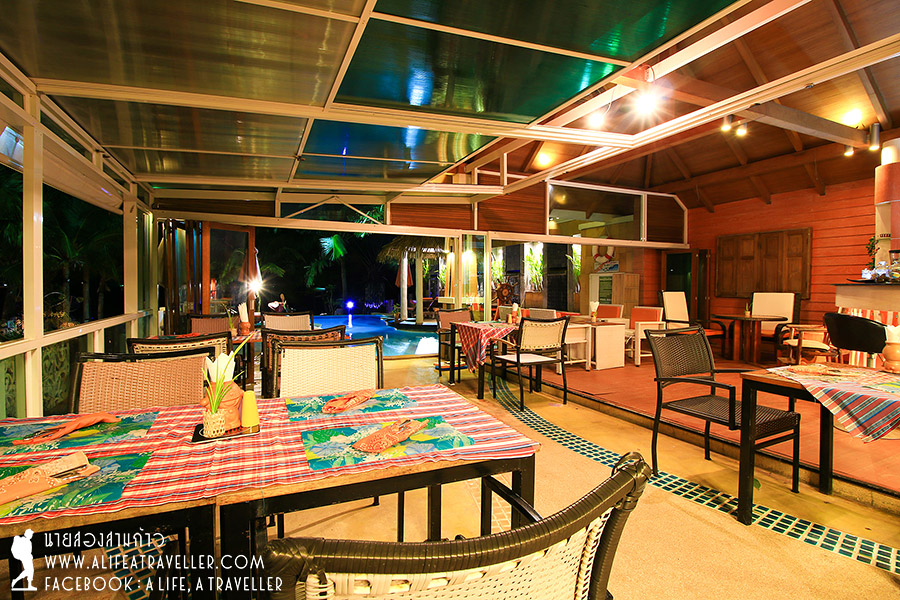 เราพักผ่อนในรีสอร์ทจนถึงเวลาดินเนอร์ ห้องอาหารอยู่ข้างสระน้ำ บรรยากาศดี ลมทะเลพัดถ่ายเท เย็นสบายตลอดเวลา