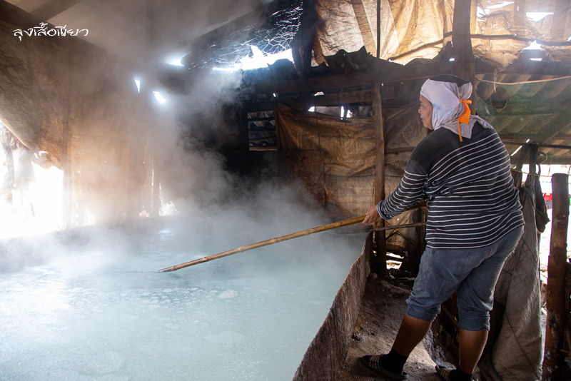 ชาวบ้านจะสูบน้ำเกลือที่อยู่ใต้ดิน ลึกจากพื้นประมาณ 100 เมตร คล้ายๆ บ่อบาดาล สูบน้ำขึ้นมาไว้ในบ่อพัก จากบ่อพักก็จะนำมาต้มในหม้อต้มขนาดใหญ่ ต้มไปเรื่อยๆ จนเดือดปุดๆ และเกิดฝ้าบนผิวน้ำ สักพักฝ้าจะตกตะกอนนอนก้นเป็นผลึกเกลือ จากนั้นชาวบ้านจะตักเกลือที่นอนก้นขึ้น รอจนเกลือสะเด็ดน้ำ แล้วจึงนำมาเก็บไว้ที่เก็บเกลือ รอการกรอกลงกระสอบ ราคาเกลือที่ได้ประมาณกิโลกรัมละ 2-3 บาทครับ