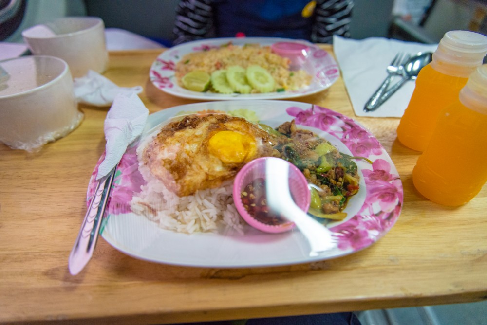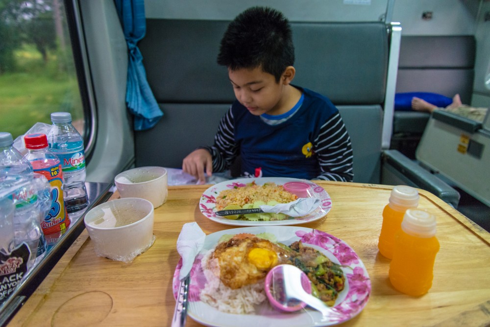 นั่งไปเรื่อยชมวิวทิวทัศน์ด้านนอก...สถานีหลักที่จอดแวะจะมีแม่ค้าขึ้นมาขายของอาหาร ขนมนมเนย ราคาจะแพงกว่าทั่วไปนิดนึง แต่เราเลือกสั่งข้าว ร้านอาหารบนรถไฟ เป็นอาหารจานเดียวแทน จะมีเจ้าหน้าที่ของร้านอาหารบนรถไฟมาเดินถาม แจกเมนูสำหรับผู้โดยสาร เราสั่งไว้ก่อนบอกว่าให้มาส่งประมาณ 6 โมงเย็น ตรงเวลาเป๊ะ มาเลยคร๊า...อาหารเย็นของเราสองคนแม่ลูก แพคมาซะเรียบร้อยน่าทานมากกกก ชุดนี้จัดไปชุดละ 100.- บาท คนละชุด อิ่มหนำกันแล้วเจ้าหน้าที่จะเดินมาเก็บจาน หลังจากนั้นก็มุมใครมุมมัน พักผ่อนกันยาวววววว...ไป