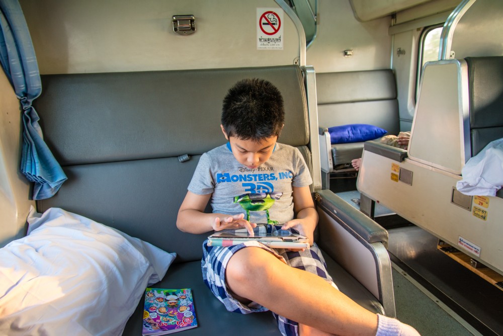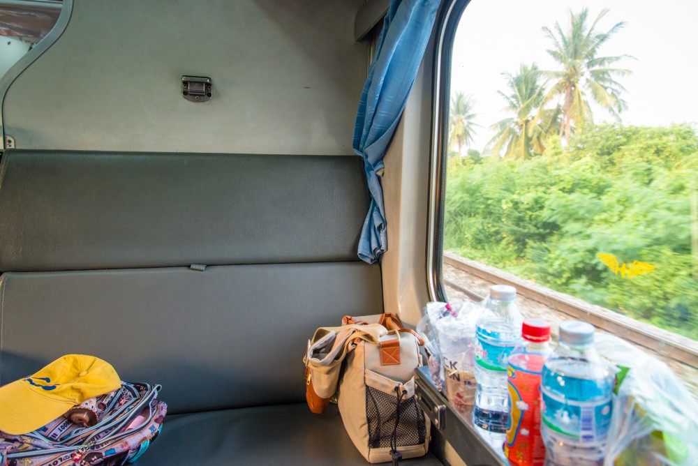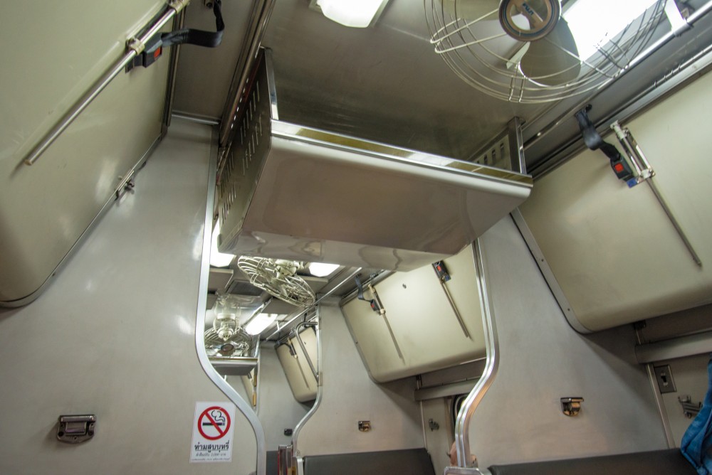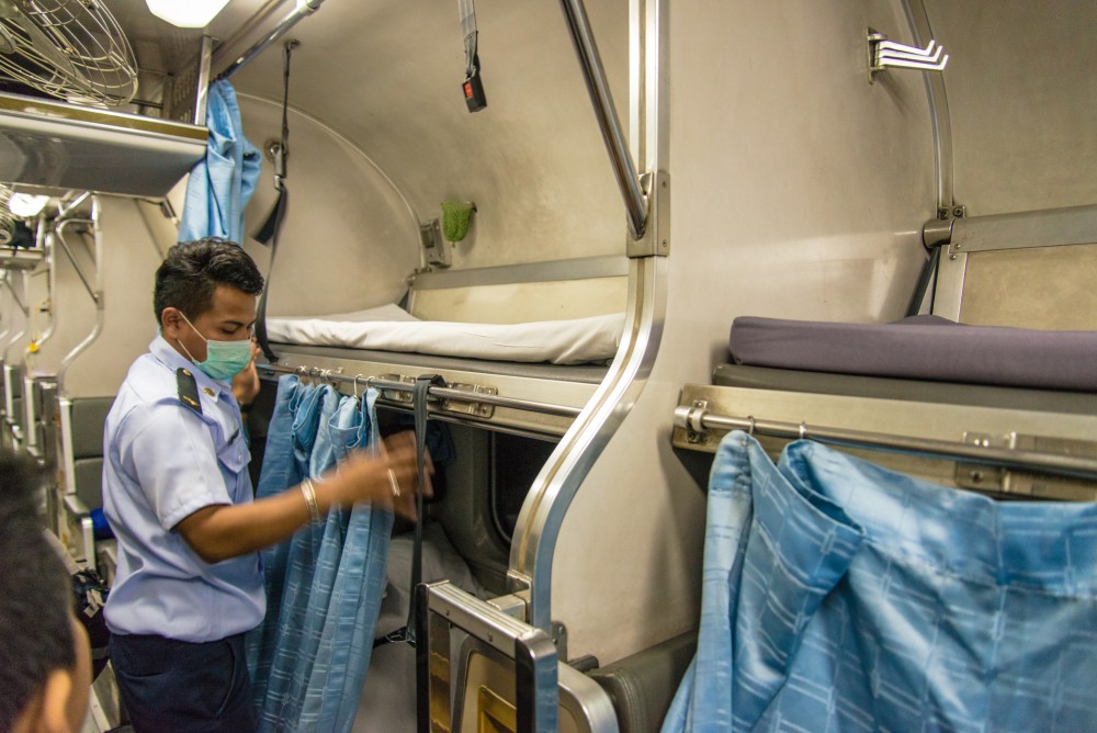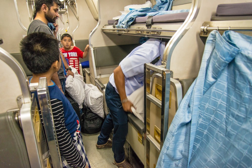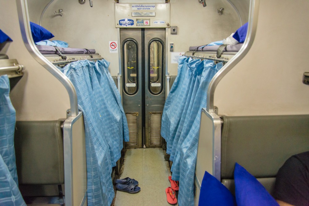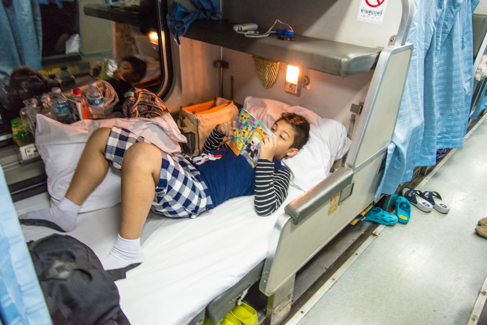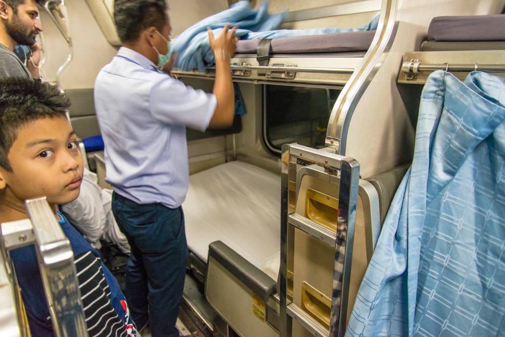 ประมาณทุ่มครึ่งเจ้าหน้าที่ประจำรถไฟจะมาเปลี่ยนที่นอนให้ เริ่มเปลี่ยนจากที่นั่งเป็นที่นอนแล้ว ปูผ้าปูที่นอน ปลอกหมอน ผ้าห่ม สะอาดสะอ้าดดีแท้ ^^ แถ่น แถ่น แถ้นนนน มาแล้วววที่นอนเราสองคนแม่ลูกคืนนี้ เตียงใครเตียงมัน ตรงหัวเตียงมีโคมไฟให้ด้วย อ่านหนังสือได้ มีผ้าม่านบังสายตาจากเตียงตรงข้าม แนะนำหากจะนอนให้เอาปลายผ้าม่าน เหน็บกับที่นอนแล้วเอากระเป๋าเรานั่นแหละค่ะ ทับไว้เลย ปลอดภัยไว้ก่อน ถึงจะมีตำรวจคอยเดินตรวจตราความเรียบร้อย แต่ก็ต้องกันไว้ก่อน ยิ่งผู้หญิงด้วยการแต่งกายควรทะมัดทะแมงนะค่ะ เสื้อผ้าล่อแหลม งดดด..เลยคร๊าเก็บไว้ใส่ที่บ้านดีกว่าโน๊ะ ^^
