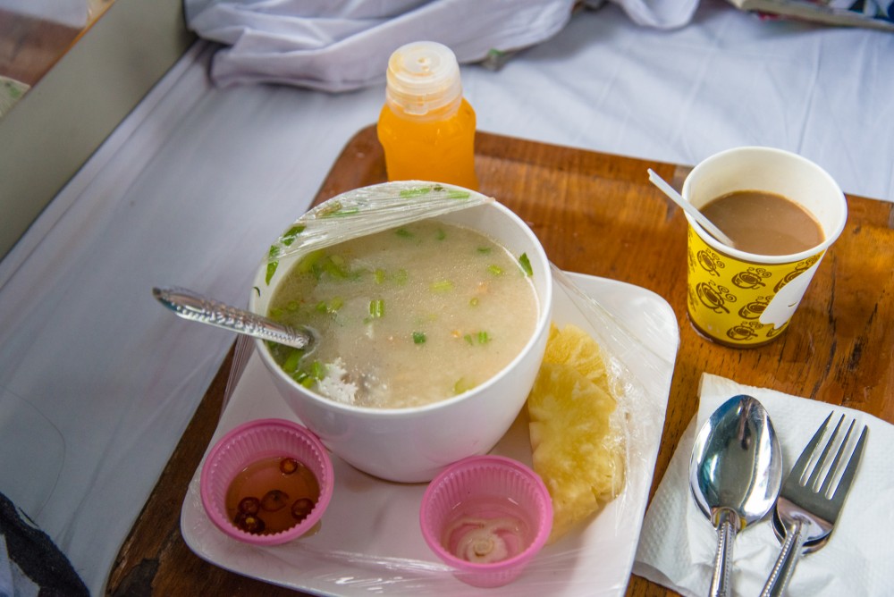 คืนนั้นหลับไปด้วยความเพลียบวกกับไม่มีอะไรทำ ก็นอนละกัน....ประมาณเที่ยงคืนเริ่มรู้สึกแอร์มันเริ่มไม่เย็น และเหมือนว่ารถไฟมันไม่ได้วิ่ง นานเป็นชั่วโมง จอดนิ่งไม่ขยับ เอาแล้ววว...ไม่กล้าชะเง้อหน้าออกมาถามใคร รอมันละจนเช้ามืดเริ่มมีคนเดินมาเลยถามว่าอยู่ไหนแล้ว เค้าบอกยังไม่ถึงพัทลุงเลย ซึ่งจริงๆ ต้องถึงพัทลุงแล้ว พอดีเมื่อคืนไฟหน้าหัวจักรมันขาดจอดเปลี่ยน แล้วก็ก็ต้องรอขบวนรถไฟอีกขบวนเปลี่ยนรางกัน เพราะขบวนที่นั่งมาเสียเวลาไปเยอะ....ก็นั่งรอกันต่อไป สรุปแล้วถึงสถานีหาดใหญ่ประมาณ 9.30 น. ช้าไป 3 ชั่วโมง รถไฟไทยเชื่อใจเรื่องเวลาไม่ได้จริงๆ 5555++++ ด้วยที่ช้า เลยต้องสั่งข้าวเช้าให้เด็กน้อยทานก่อน อันนี้ชุดข้าวเช้าค่ะ ชุดละ 100.- พร้อมน้ำส้มในเซทด้วย ทานเสร็จก็นั่งรออย่างเดียว....