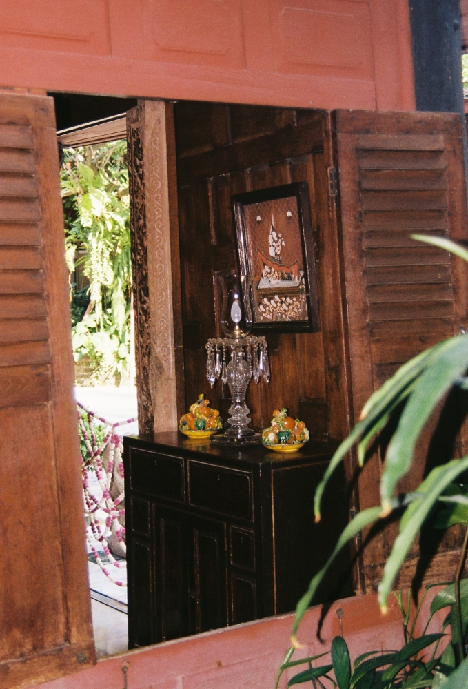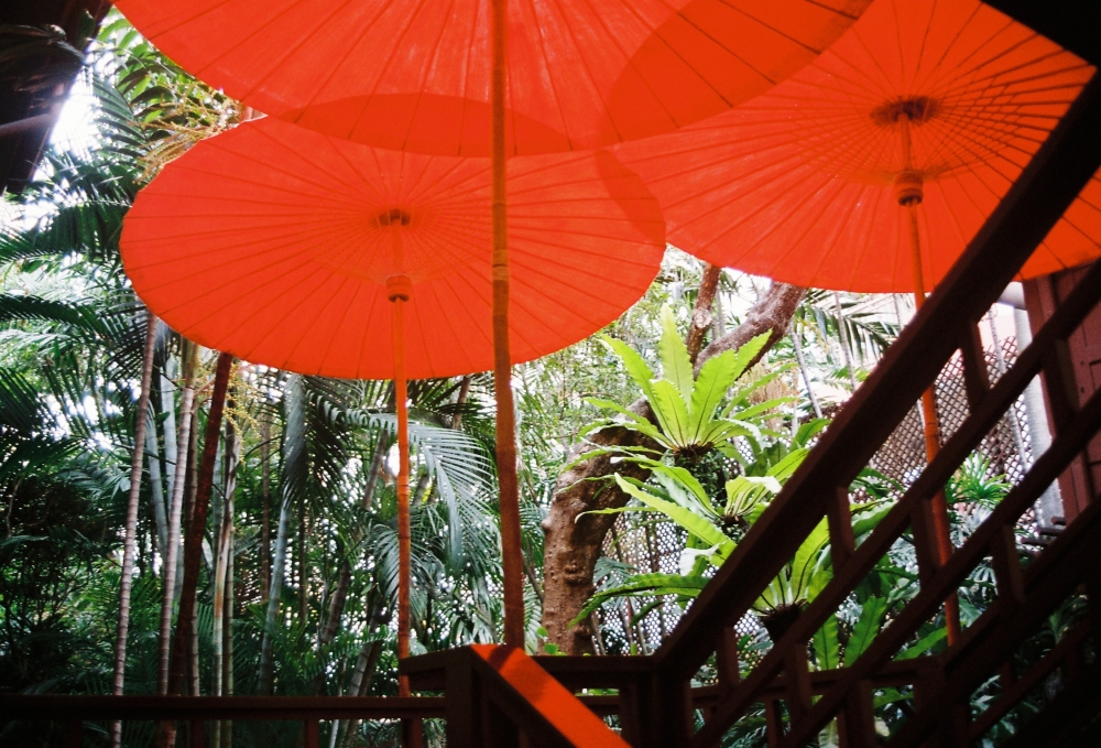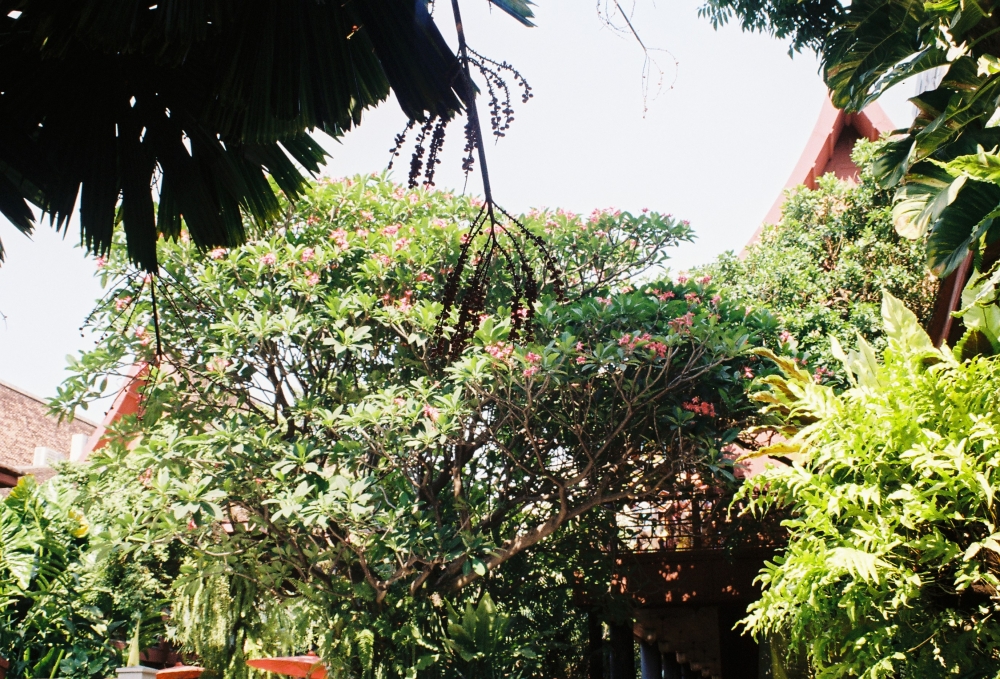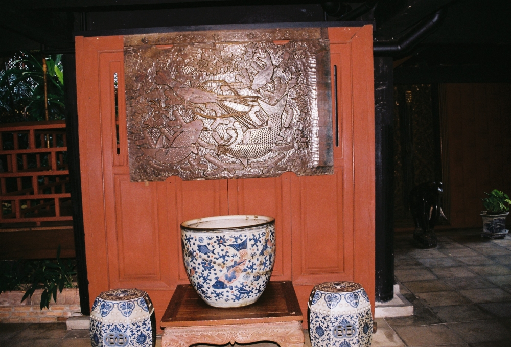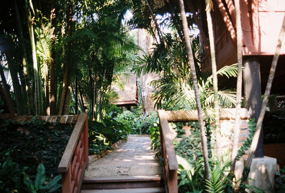 รูปแยะมากถ่ายจนเมื่อย แดดสะท้อนเข้าตาจนต้องหาที่หลบแดด เจอเด็กๆนั่งกินขนมกันอยู่เลยขอถ่ายรูปเอาไว้ ระหว่างนั้นเจอน้องคนนึงกำลังถ่ายรูปอยู่เหมือนกัน และกำลังหานางแบบถ่ายคู่กับรูปบนผนัง เลยมาขอให้เราเป็นแบบให้ น้องขอพี่ก็ให้ เลยไปยืนแอ็คท่าเป็นแบบจำเป็นให้น้องเขาถ่ายรููปจนหนำใจ ก่อนจะไปถ่ายรูปของเราบาง เก็บรูปครบแล้วก็เดินเล่นเรื่อยเปื่อยข้ามมาอีกฝั่งหนึ่งของสะพานหัวช้าง ไปเก็บรูปท่าเรือ แถวๆนั้นก็มีรูปให้เก็บเหมือนกัน แต่ต้องเดินลึกเข้าไปอีก เลียบคลองแสนแสบเข้าไปมีรูปอยู่ตลอดทาง เราเก็บแค่แถวๆท่าเรือแล้วเดินไปต่อ จุดหมายอยู่ที่บ้านจิมทอมสันป์ ที่นี่ก็ตั้งใจมาหลายครั้งแต่ไม่ได้มาสักที วันนี้เลยจัดรวดเดียวสองที จากสะพานหัวช้างเดินมาเรื่อยๆผ่านหอศิลป์กรุุงเทพเดินขึ้นไปทางสนามกีฬา ปากซอยมีป้ายบอกทางเบ้อเร่อ เดินไปสุดซอยอยู่ตรงซ้ายมือพอดี ต่างชาติเพียบ เสียค่าเข้าสองร้อย มีไกด์พาทัวร์ เราได้ไกด์รอบสามโมงยี่สิบห้า เหลือเวลาประมาณครึ่งชั่วโมงระหว่างนั่นก็เข้าไปถ่ายรูปบริเวณรอบๆรอ