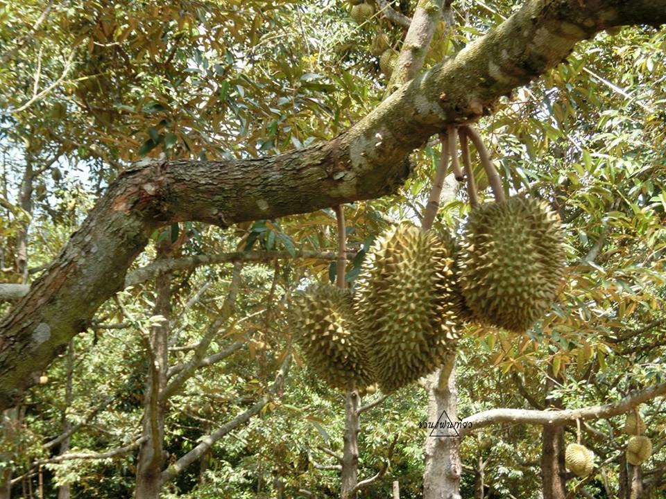ถัดออกมาอีกนิดก็ยังคงเป็นต้นทุเรียนอยู่ดีค่ะ555 ต้นนึ่งก็จะมีผลประมาณ9-10ลูกหรืออาจจะเยอะกว่านั้นก็ได้นะคะ ทุเรียนที่ชาวบ้านนิยมปลูกกันตอนนี้ก็จะเป็นสายพันธุ์หมอนทองซะส่วนใหญ่ แล้วก็จะมีก้านยาวแทรกเข้าไปบ้างแต่ที่นี่จะไม่ค่อยนิยมปลูกทุเรียนสายพันธุ์ชะนีกันสักเท่าไหร่ค่ะเนื่องจากหากนำทุเรียนสายพันธุ์ที่ต่างกันมาปลูกใกล้กันจะทำให้ทุเรียนสายพันธุ์นั้นๆเพี้ยนไปได้ค่ะ