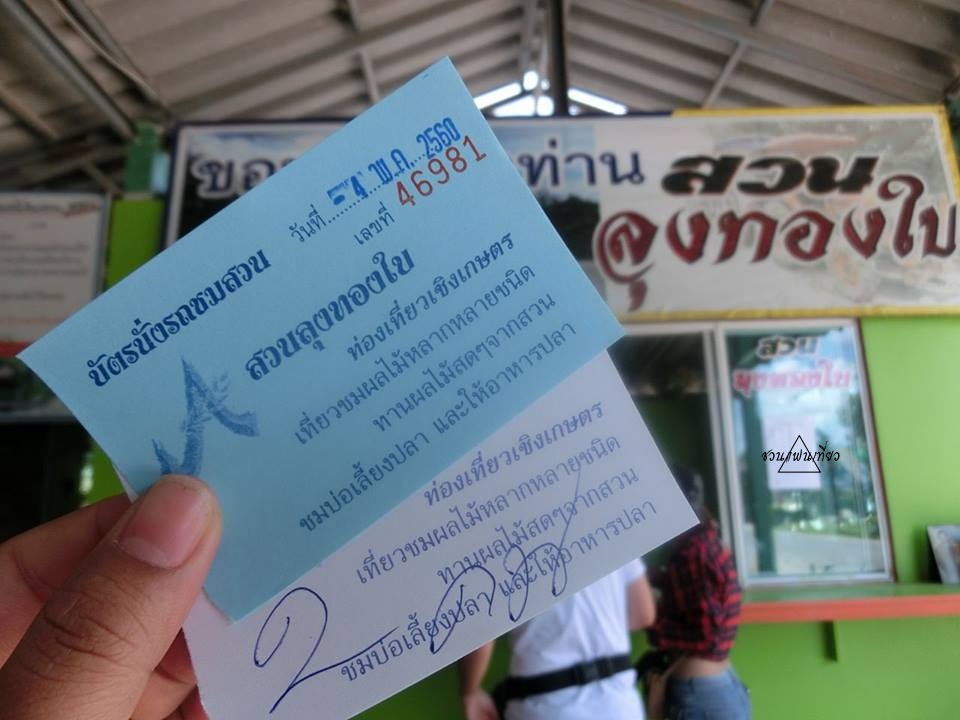 เข้ามาทางด้านในนักท่องเที่ยวทุกคนต้องทำการซื้อตั๋วให้เรียบร้อยก่อนถึงจะเข้าไปชมสวนได้นะคะ ตั๋วที่เจ้าหน้าที่ให้เรามาก็จะมี2ใบ ใบแรกสีฟ้าจะเป็นตั๋วนั่งรถชมรอบๆสวน ส่วนอีกใบจะเป็นตั๋วสีขาวใบนี้ห้ามหายเลยนะคะตั๋วใบสีขาวนี้ไว้สำหรับทานผลไม้บุพเฟ่ค่ะ ห้ามหาย ห้ามหายยยย TwT และก่อนที่เราจะท่องเที่ยวสวนผลไม้ เราควรเข้าใจว่าผลไม้นั้น มีเงื่อนไขหลายอย่างเช่น สภาพอากาศ น้ำ ฯลฯ ดังนั้นเราควรโทรเช็คที่สวนผลไม้ว่า มีผลไม้พร้อมให้รับประทานหรือไม่ เปิดให้เข้าชมช่วงไหน และราคาเท่าไร เพราะราคาผลไม้ก็มีตัวแปรหลายอย่าง อย่างตอนที่เราไปเป็นช่วงที่ผลไม้เพิ่งจะออกผลพอที่จะให้เราได้เลือกทานกันได้ ราคาก็จะอยู่ที่350บาทต่อคนนะคะ ส่วนเด็กเล็กทางสวนจะมีส่วนสูงกำหนดให้ว่าเด็กสูงเท่าไหร่ถึงจะเสียค่าบริการ