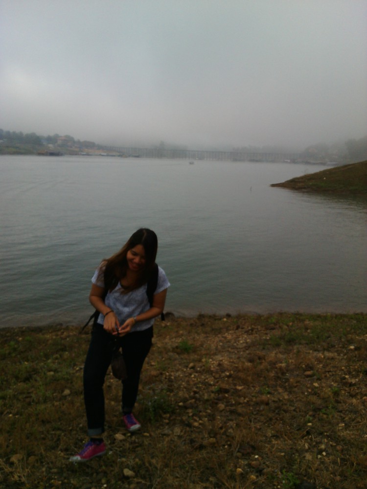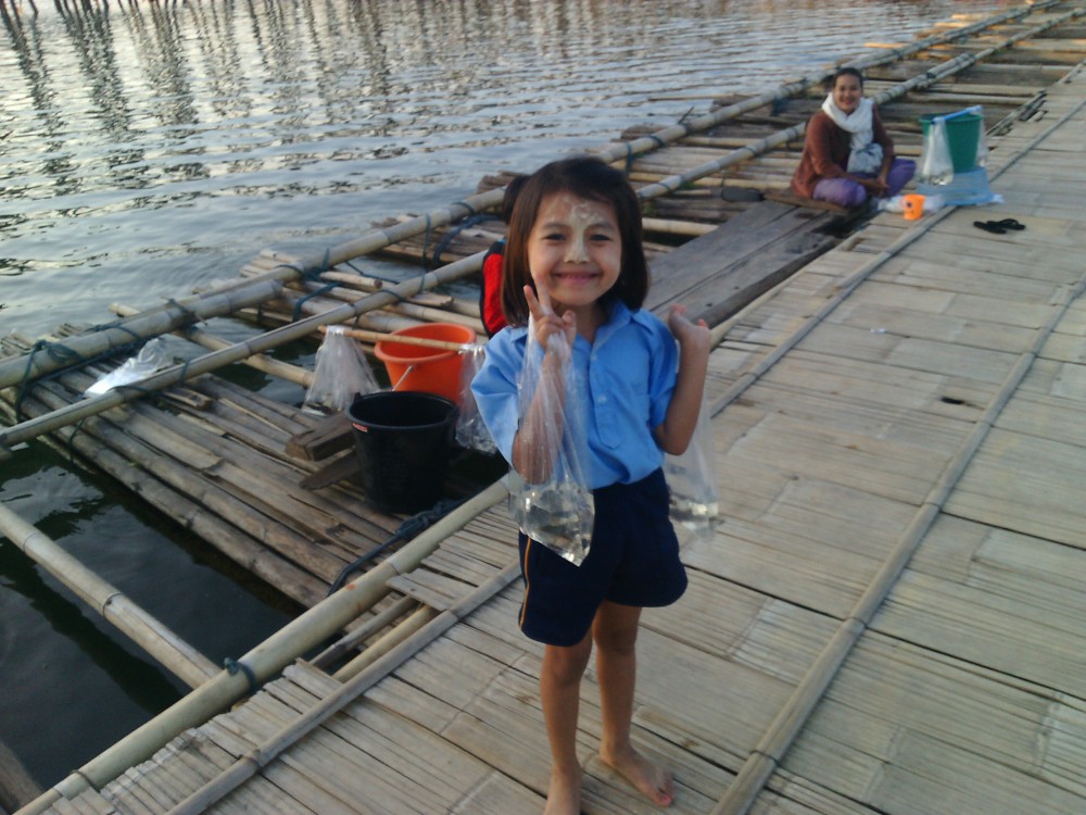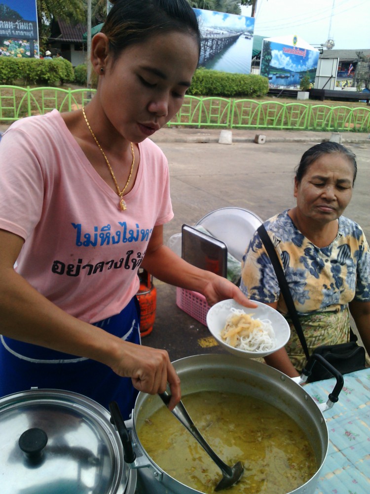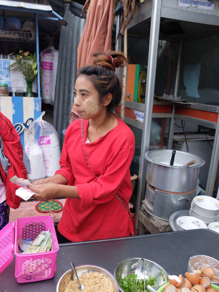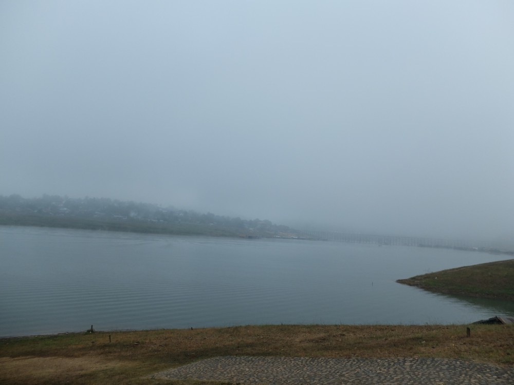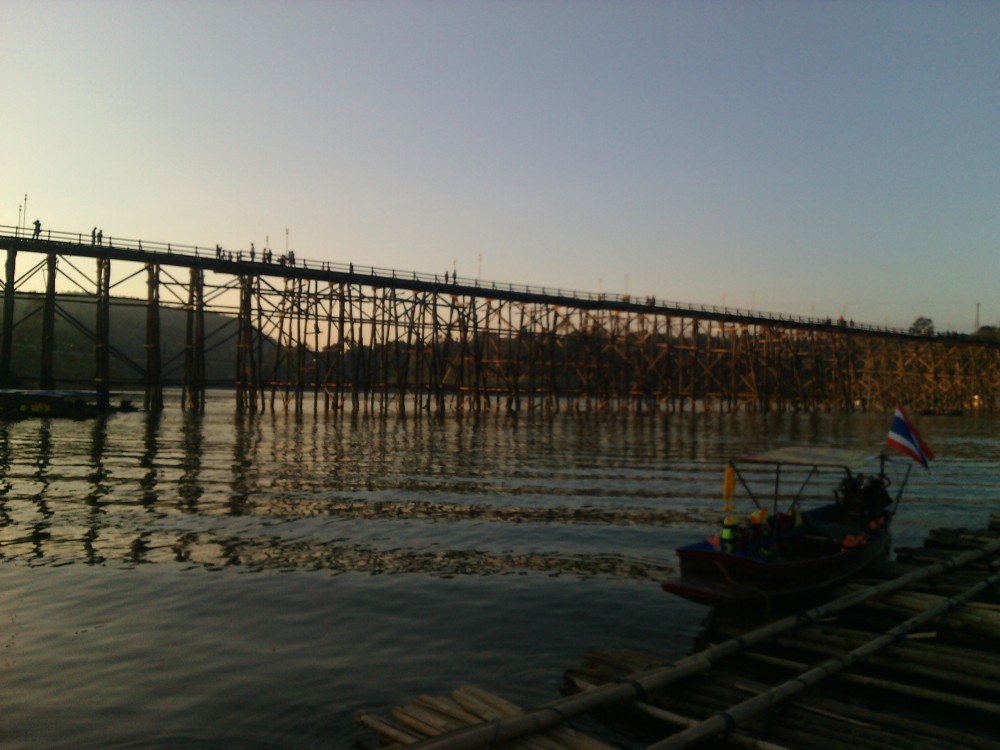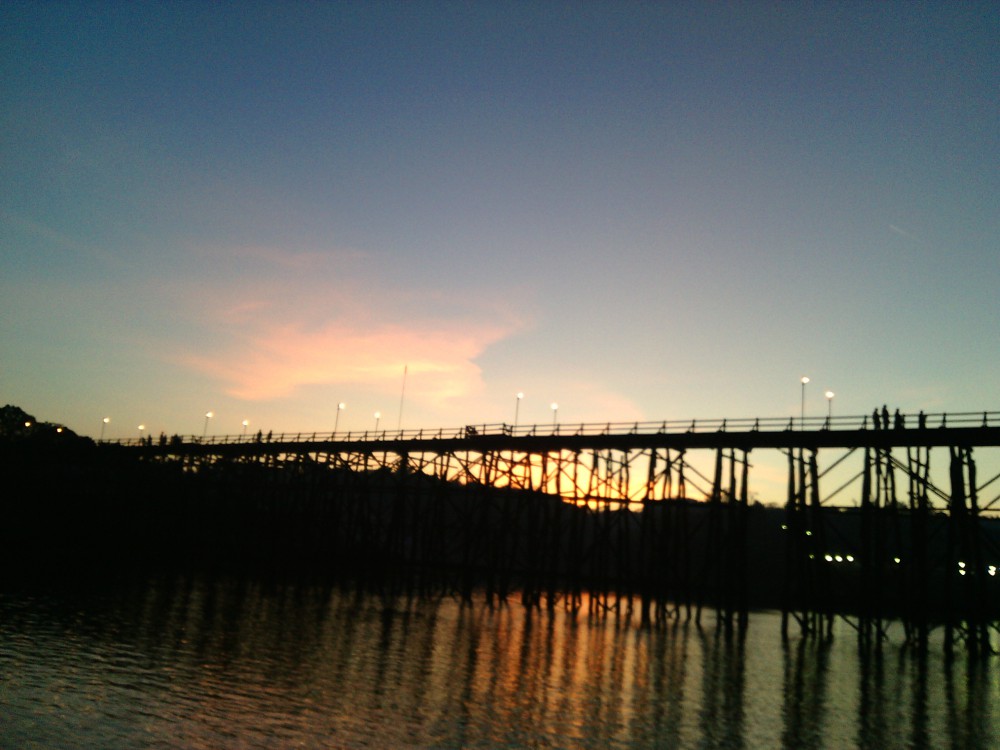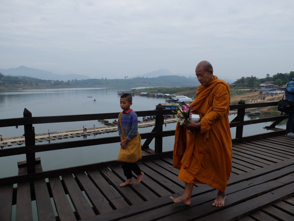 นี่คือตอนมาถึงสะพานมอญเเล้วเเละกำลังข้ามไปฝั่งมอญ มีพระรูปหนึงเดินมาบิณฑบาตรพอดี  อากาศตอนนั้นก็เย็นดีเเต่ไม่ได้ถึงกับหนาวมากมายอะไร เจ้าของเกวสเฮาส์บอกว่าวันนี้หมอกน้อยอากาศไม่หนาวเเต่ถ้าเป็นเมื่อวานหนาวเเละหมอกก็เยอะกว่านี้ด้วย สรุปเรามาผิดวันใช่ไหม = =! เเต่ก็ไม่ได้เลวร้ายอะไรนะ เราว่ามันก็สวยอยู่ดี  ตอนที่มาเรายังไม่ได้กินข้าวเช้า เลยสั่งโจ๊กกินที่ร้านพี่คนนี้ พี่เขาเป็นคนมอญ พูดเก่ง น่ารักดี กินเสร็จเราขอพี่เขาถ่ายรูปด้วยเเล้วก็พากันเดินต่อ  เดินสำรวจจนเป็นที่พอใจ กะว่าจะนั่งเรือไปดูวัดใต้น้ำเเต่เปลี่ยนใจไปเช็คเอาท์ออกก่อนดีกว่า  เเล้วขนของไปไว้ที่ชื่นใจเฮาส์ จะได้เที่ยวเเบบไม่ต้องห่วงอะไร