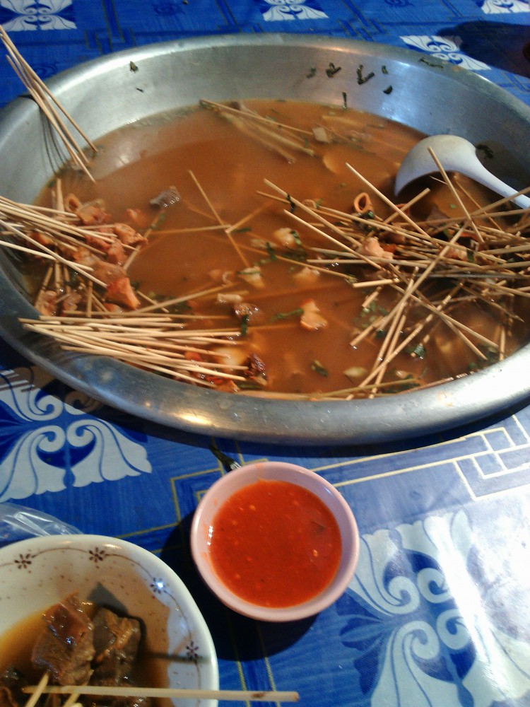 เจอเเล้ว!! ของกินที่ตามหาที่พม่าเเต่ดันไม่ทันเพราะเขากลับไปเเล้วในที่สุดเราก็ได้กิน  มันเป็นเหมือนหมู เนื้อ ตับ เเล้วก็มีอย่างอื่นด้วย เป็นชิ้นๆ เสียบไม้  ไม้ละบาท เขาบอกให้ได้อรรถรสต้องยืนกินมันนั้นเเหละ  เเต่ร้านนี้เขามีเก้าอี้ให้นั่ง อร่อยอีกเหมือนกัน  ชอบบบบบ