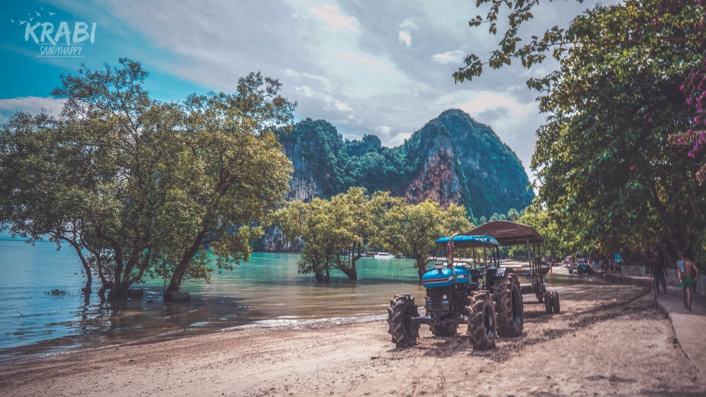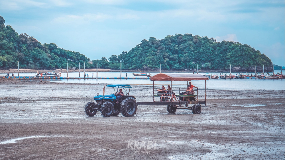 หาดไร่เลย์ตะวันออก ตอนเย็นน้ำลงไปเยอะเลยค่ะ จนต้องมีรถแบบนี้ไปรับนักท่องเที่ยวมา ไม่งั้นเดินกันไกลเลย