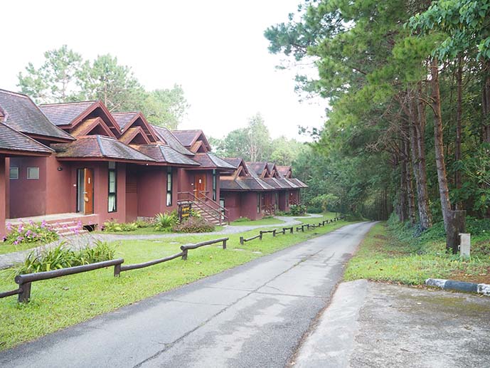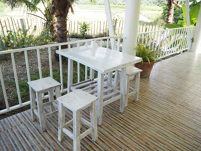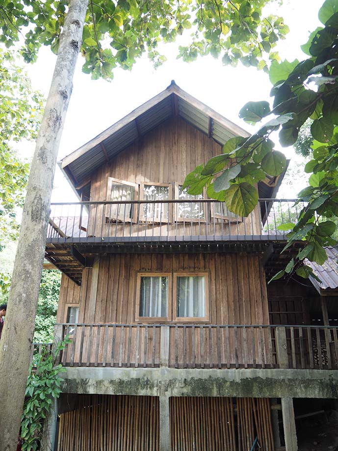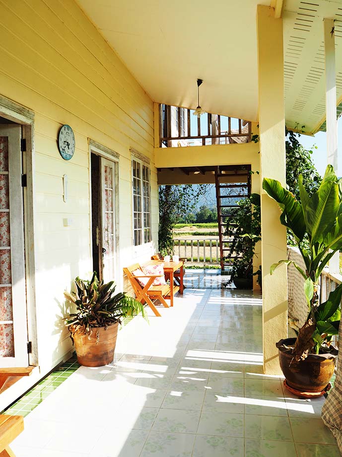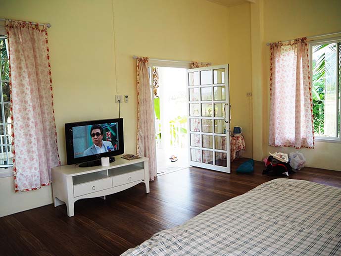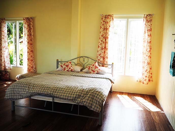 ที่เห็นนี่คือเรือนคันทรี่ เป็นบ้านไม้สีขาว ผ้าม่านลายดอก โดนใจเจ้ฝุดๆ เยย ชั้นล่างน่ะตานงค์ (เจ้าของ) กับป้าเพียร (ภรรยา) พักอยู่ เป็นห้องครัวด้วย ส่วนชั้นสองมีสองห้อง ชั้นสามมีหนึ่งห้อง แต่ละห้องก็คืนละ 500 เท่านั้น แต่ถ้าเป็นหน้า high ก็ 700 บาทเอง มาดูหลังเต็มๆ กัน
