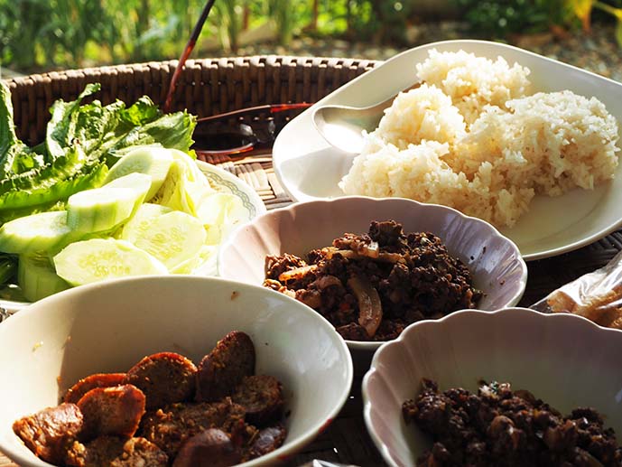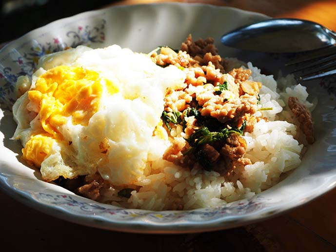 ในเรื่องของอาหาร ที่นี่ไม่มีฟรีมื้อเช้าหรอกค่ะ แหม่..ที่พักถูกเยี่ยงนี้ ไม่มีไม่เดือดร้อนอันใดเลย แต่ถ้าหิวก็บอกป้าเพียรทำให้กินได้เลย แต่เนื่องจากที่นี่เป็นวิถีชาวบ้าน อาหารที่สั่งอาจไม่ได้รวดเร็วทันใจนัก ลักษณะเป็นเหมือนแม่ทำข้าวให้ลูกกิน รอนานหน่อยแต่อร่อยดี อิอิ อย่างจานนี้ ง่ายๆ ก่อนนะ