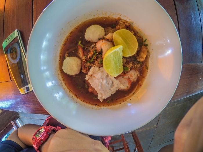 // ถึงสังขละ เช้ามาก9โมง เวลาเชคอิน บ่าย2 แวะเรยมื้อเช้า เตี๊ยวเจ๊พร คัยที่เคยมาสังขละ ต้องมีแวะ ชาม30นิดนึง นั่งปั๊บจะสั่งละเรยถามคนจดเมนูก่อน #น้องคับอะไร่อร่อยๆแนะนำหน่อยสิคับ