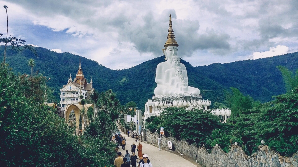เห็นเด่นเป็นสง่ามาตั้งแต่ไกล โดยมีภูเขาด้านหลัง
