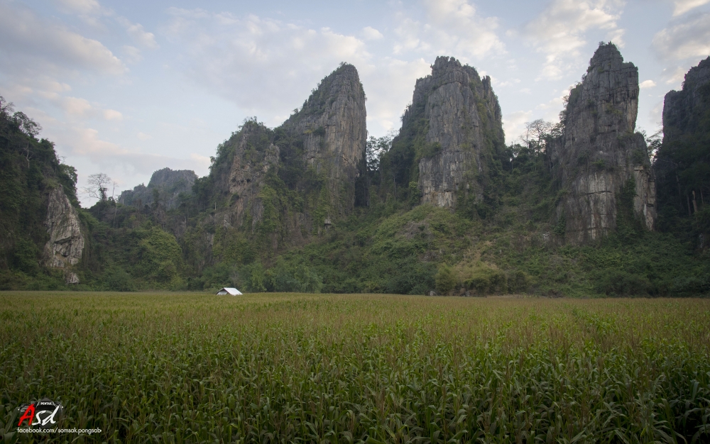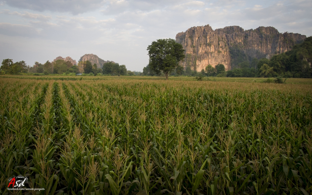 บางช่วงเป็นไร่ข้าวโพดที่กำลังออกดอก บางช่วงเป็นไร่อ้อย