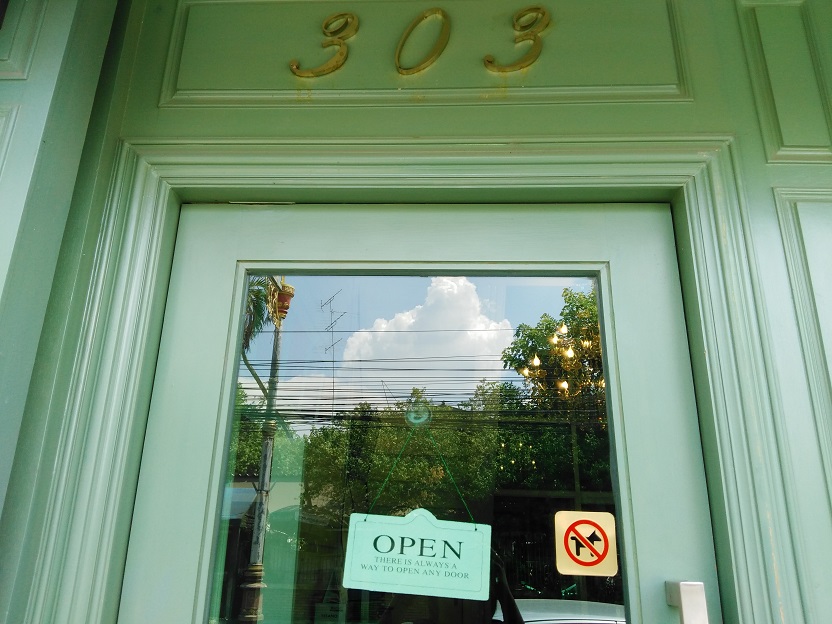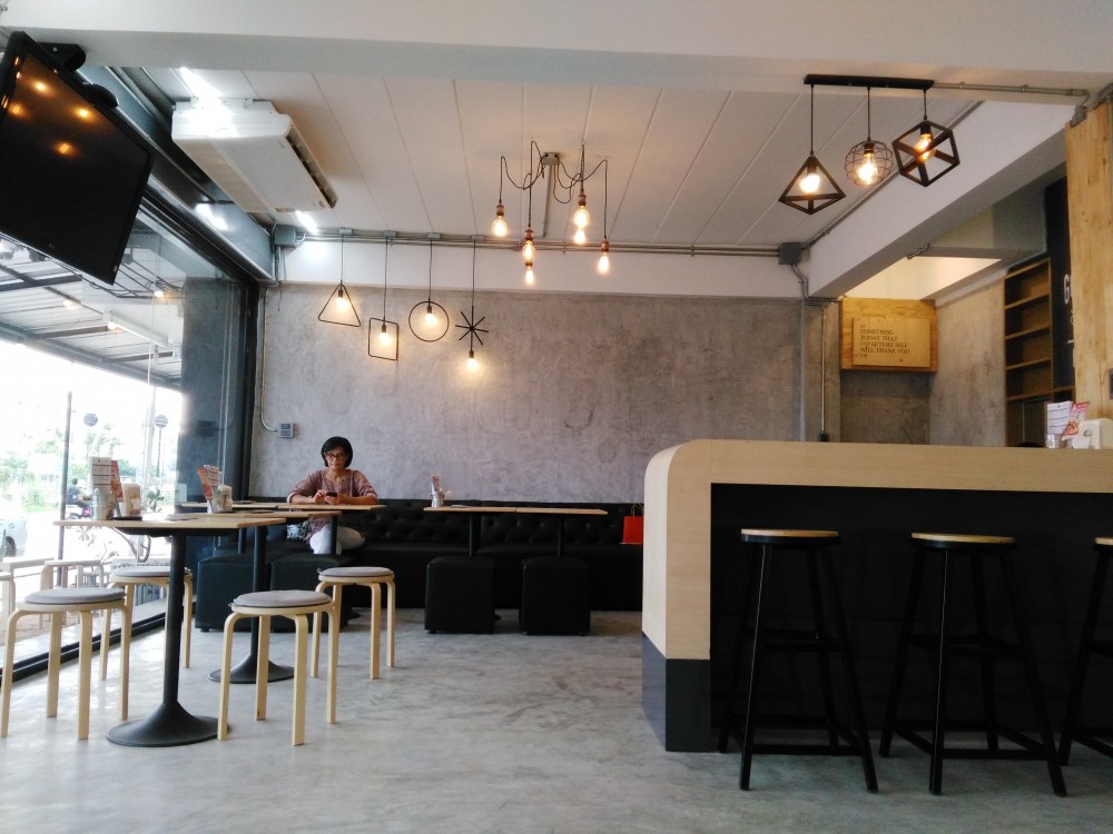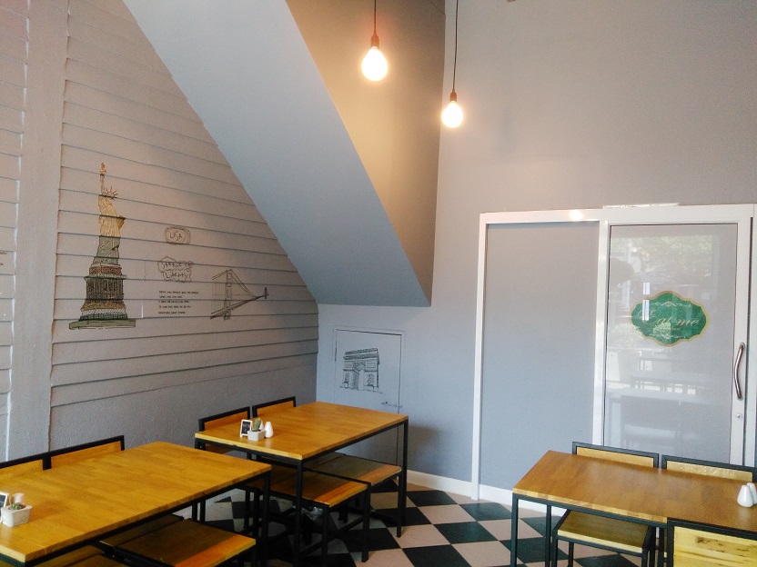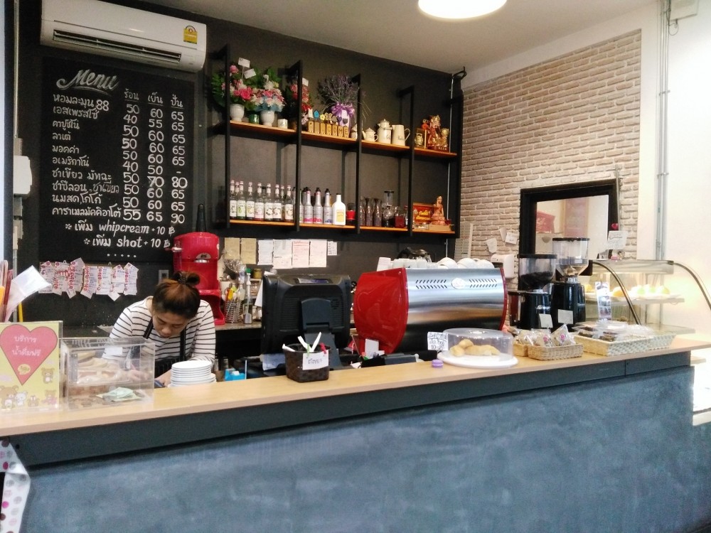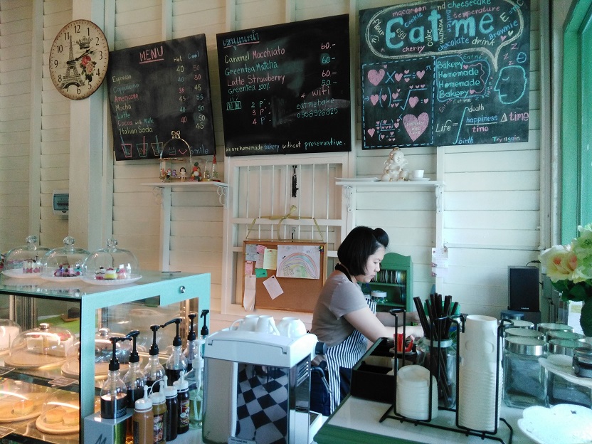 ร้านนี้อยู่เยื้องกับวัดศรีบุรีรัตนาราม (หรือวัดเพรียว) ถนนเส้นนี้ก็ดูจะเป็นเส้นที่รถแน่นพอสมควรเนื่องจาก มีรถจอดทั้งสองข้างทาง ถ้าโชคดีจะมีที่จอดหน้าร้าน ไม่งั้นก็เดินไกลหน่อยค่ะ จอดที่วัดแล้วเดินมาได้ ดูจากนอกร้านนี่เหมือนต่างประเทศเลย สีเขียวพาสเทล พอเข้าไปในร้านจะเป็นสีขาว มีห้องแยกไปอีกต่างหากเป็นสีเทา ตัดกับเก้าอี้ไม้ กำลังพอดี เค้กที่ร้านส่วนมากเป็นเค้กหน้านิ่ม ลองชิมเค้กช็อคโกแล็ตแล้ว อร่อยดี