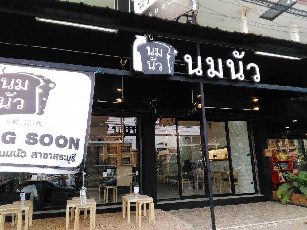 ร้านนมนัว แตกสาขามาจากในกรุงเทพฯ นะคะ มาเกิดสาขาที่สระบุรีอีกสาขาหนึ่ง อยู่เส้นหลังสถานีรถไฟสระบุรี ติดๆ กับตลาดนัดเปิดท้าย หน้าร้านดูเด่นด้วยโทนสีดำ ตัดกับในร้านซึ่งดูอบอุ่นด้วยโทนสีขาวและไฟสีนวลประดับประดาเต็มร้านไปหมด ดูซอฟท์และสบายตา นั่งกินก็สบายใจไปด้วย เมนูแนะนำของร้านนี้ที่ชิมมาแล้วอร่อยมาก คือ ข้าวราดแกงกะหรี่หมูตุ๋นไข่ข้น อร่อยจริงๆ ไม่ได้อวยเว่อแน่นอนค่ะ