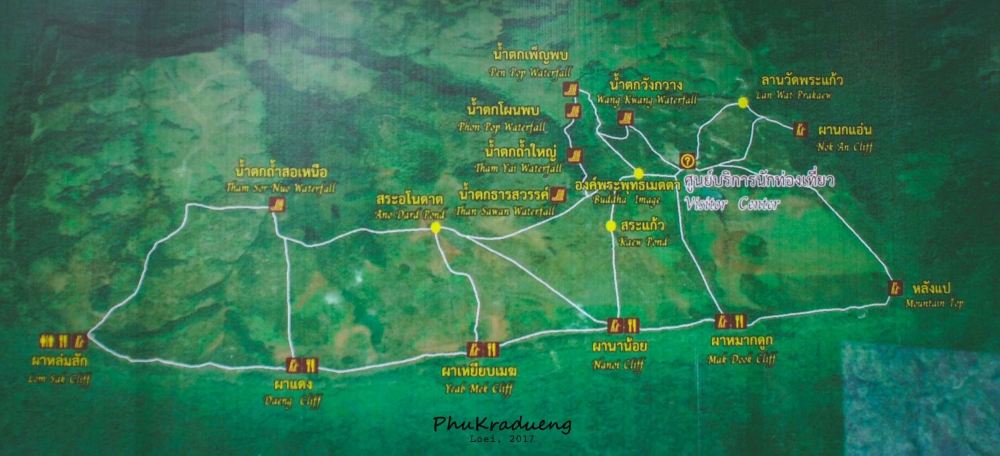 >>พวกเราวางแผนการเดินกันไว้ว่าจะเดินเก็บให้ครบเกือบทุกสถานที่บนภู ที่พวกเราสามารถจะเดินไปถึงได้ตามแผนที่ ที่มีอยู่ เพื่อให้ทันเวลาภายในหนึ่งวัน และกลับมาให้ถึงที่พักก่อนมืด หลังจากที่กินข้าวเสร็จพวกเราเริ่มออกเดินทางกันตอน 10 โมงครึ่ง การเดินทางเริ่มจากศูนย์บริการนักท่องเที่ยว >>  ไปลานพระศรีนครินทร์ >>  ไปน้ำตกวังกวาง>>  ไปสระอโนดาต >>  ไปน้ำตกถ้ำสอเหนือ >>  ไปผาหล่มสัก >>  ไปผาแดง >>  ไปผาเหยียบเมฆ >>  ไปผานาน้อย