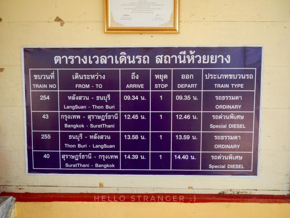 ที่สถานีห้วยยางจะมีตารางเวลาเดินรถติดอยู่ เราเก็บข้อมูลไว้ใช้สำหรับการเดินทางวันกลับ