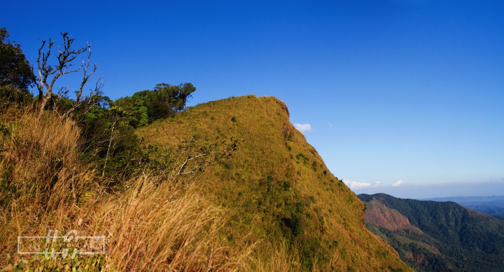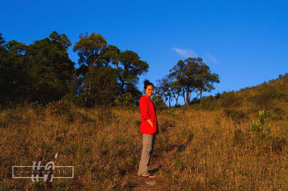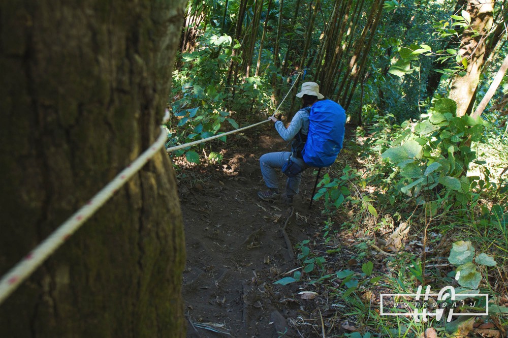 ได้คำตอบกลับมาว่า "ที่นี่มีเสือครับ มีเจ้าหน้าที่เคยเจอ เลยต้องพกมาเอาไว้ยิงใช้เสียงไล่มันครับ" เอิ่มมมม ไม่น่าถามเลยว่าไหม 555 ออกเดินไปที่ความสูงมากขึ้น ความชันก็มากขึ้นเช่นกัน มีจุดพีคจุดนึง ชันมากจนต้องมีเชือกให้ไต่ขึ้นไป เขาเรียกว่า 'เนินหมาถอย' (ไม่มีภาพนะมือไม่วางเลย)