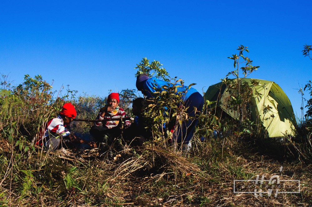 เพื่อนๆ มาถึงกันก่อนแล้วด้วย ถึงลานไม่ได้กางเต้นท์เลย ลูกหาบกางเต้นท์เสร็จไปรองน้ำมาให้ จัดการก่อไฟรอเรียบร้อยเลย