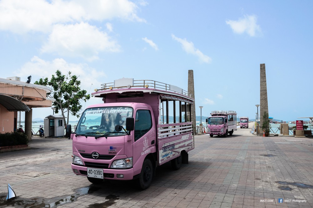 จากจุดนี้เราต้องนั่งรถโพถ้องสีชมพูคันนี้ไปสุดสะพานเลยครับ
