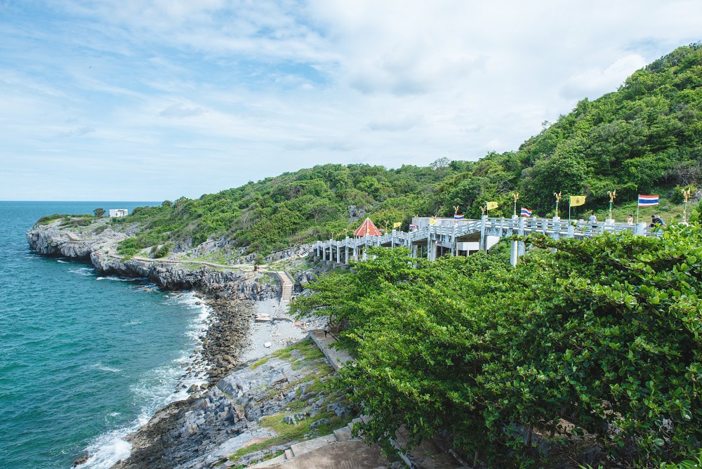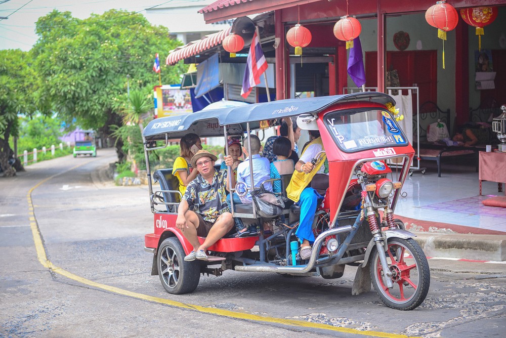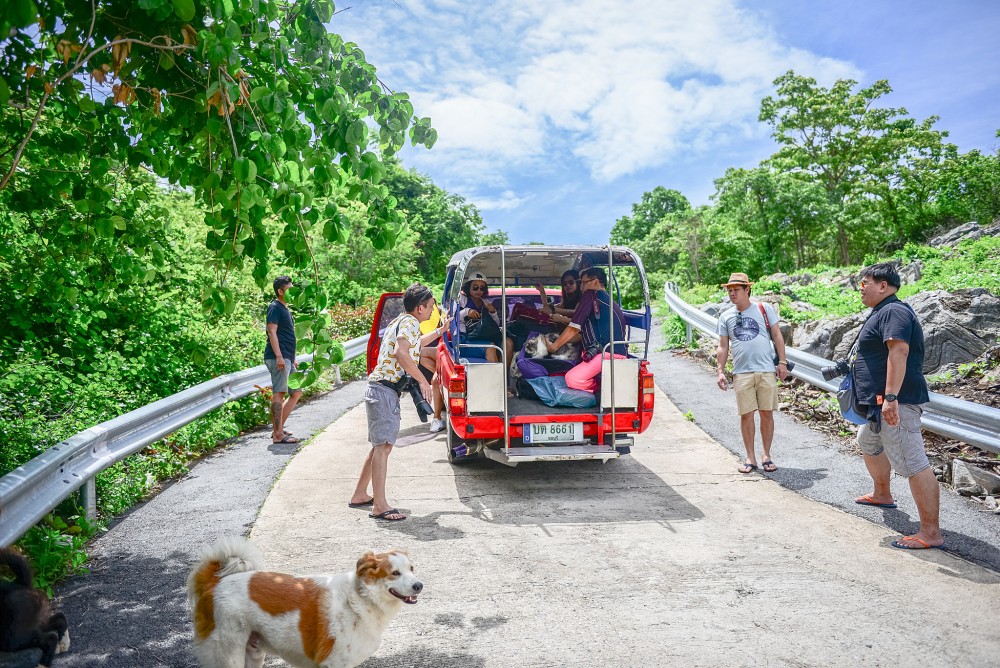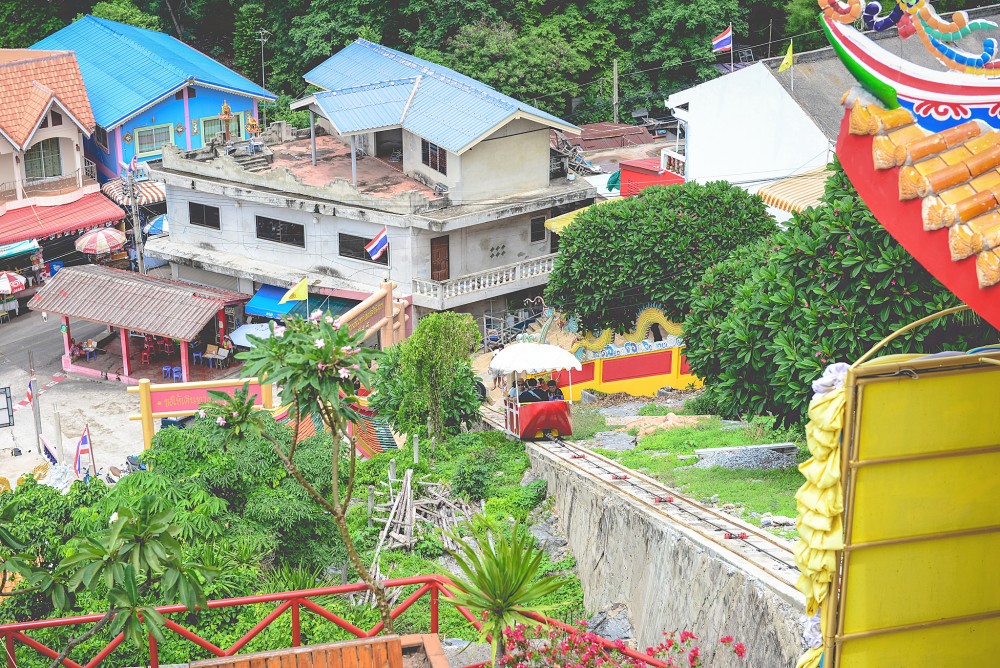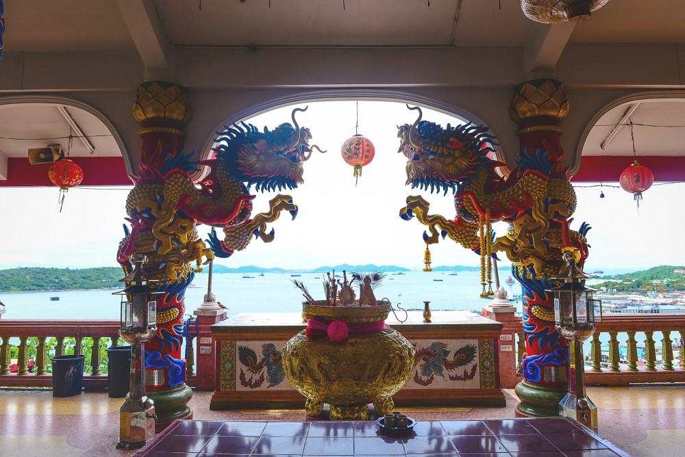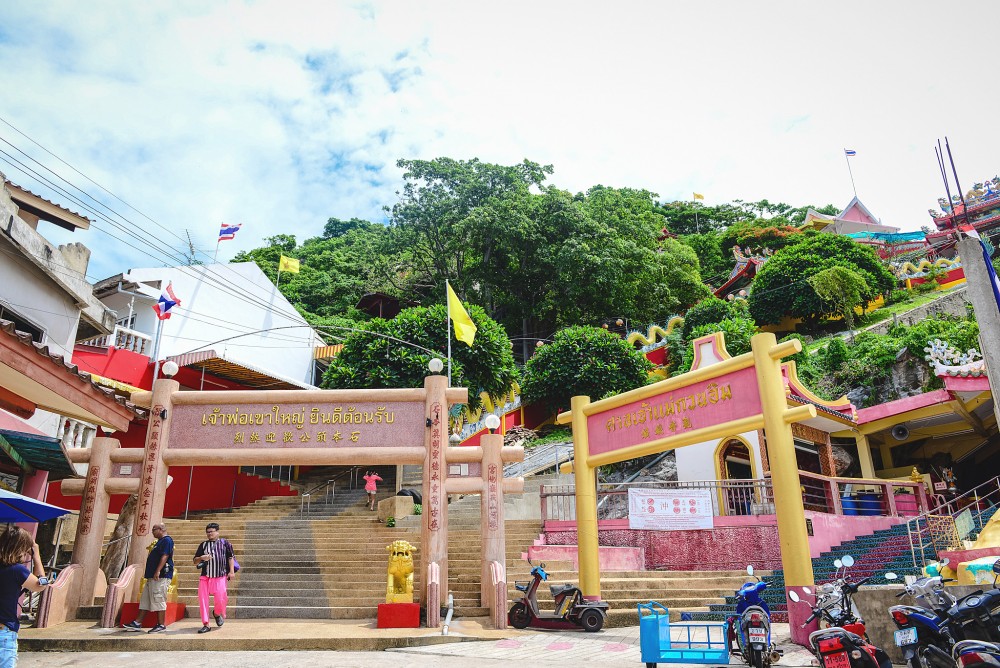 จุดที่ 1 เจ้าพ่อเขาใหญ่ และศาลเจ้าแม่กวนอิม ที่นี่มีรถรางให้ขึ้นฟรี ทำบุญตามศรัทธา ด้านบนมีสิ่งศักดิ์สิทธิ์ให้สักการะ และที่พลาดไม่ได้ มีจุดชมวิวที่เห็นชุมชนชาวเกาะฯ และท่าเรือชัดเจน