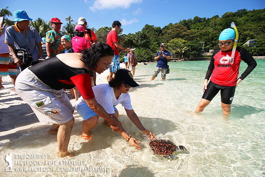 กิจกรรมสำคัญบนเกาะขามคือการปล่อยเต่ากระคืนสู่ท้องทะเล สอบถามได้ความมาว่าเป็นเต่าจากการเพาะเลี้ยงที่ศูนย์อนุรักษ์พันธุ์เต่าทะเล กองทัพเรือ ที่สัตหีบ มีความพร้อมที่จะใช้ชีวิตตามธรรมชาติแล้ว