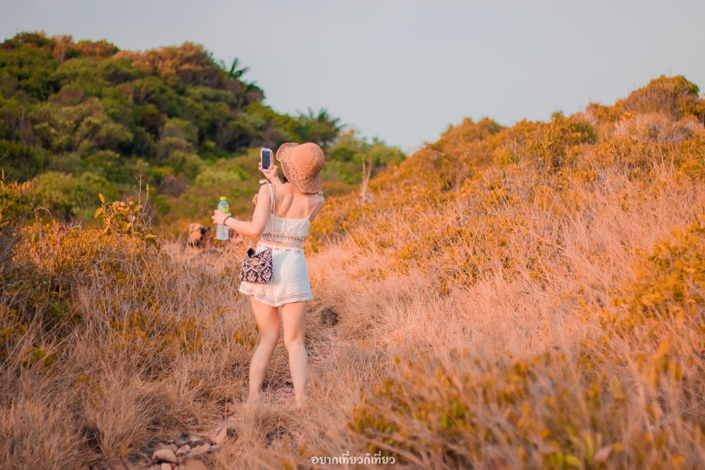 ทุ่งหญ้าโดนแสงอาทิตย์เป็นสีเหลืองๆส้มๆ ถ่ายรูปสวยมาก