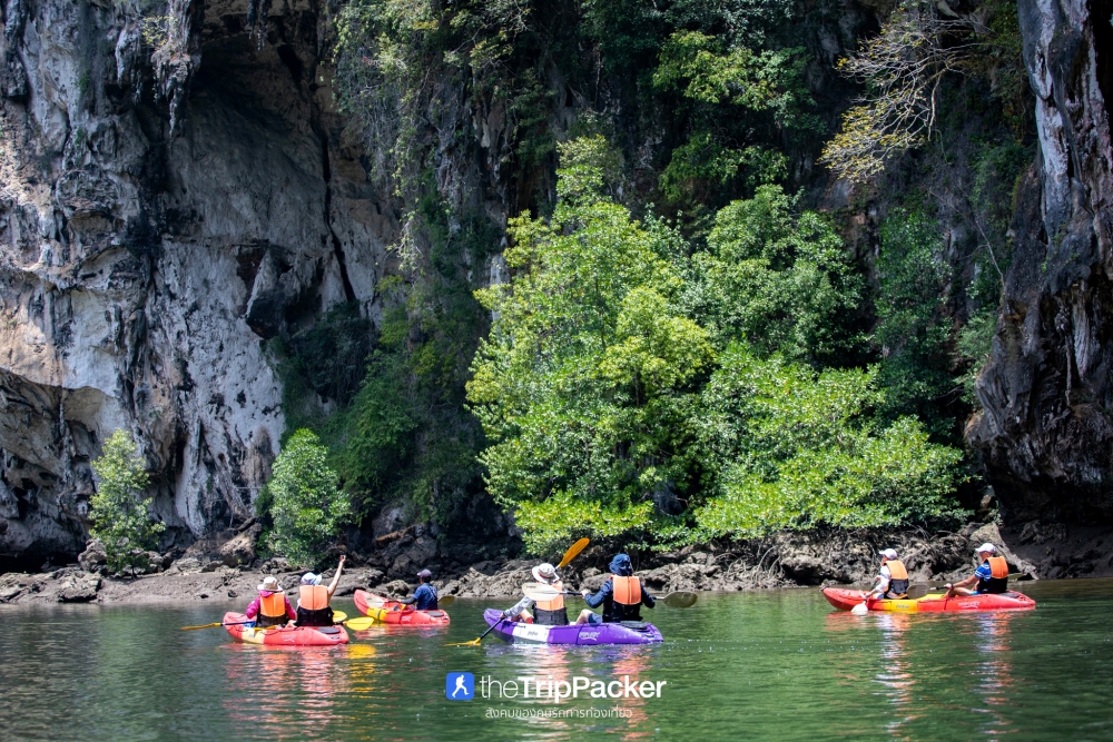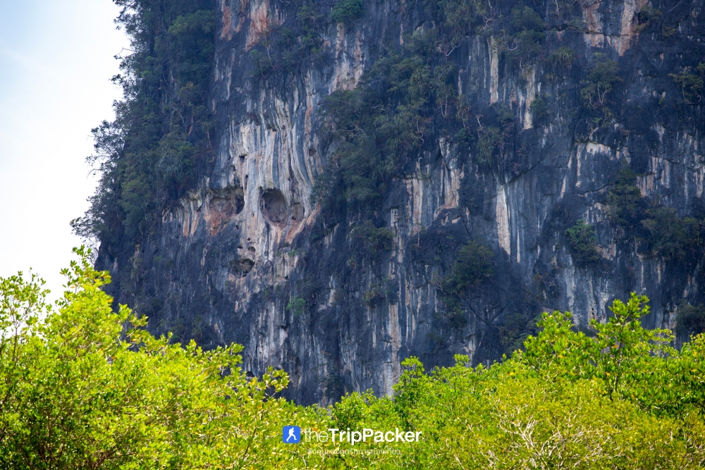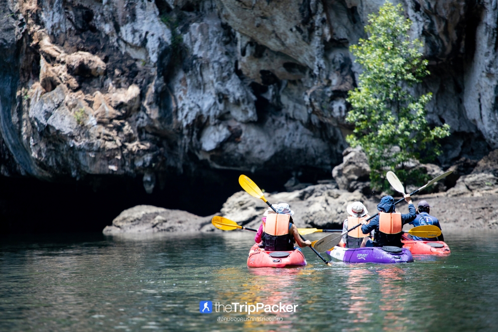 จนมาถึงจุดที่เป็นไฮไลต์อย่าง หุบเขาปีศาจ ผาหินสูงชันที่มีรูพรุนมหึมาจัดวางอยู่ในรูปแบบที่จินตนาการตามได้ไม่ยากว่าตรงไหนคือดวงตา จมูก และปาก โดยจุดนี้จะเป็นจุดที่เราจะต้องเปลี่ยนจากการนั่งเรือหัวโทงสู่กิจกรรมพายเรือคายัคเพื่อชมธรรมชาติได้อย่างเงียบสงบ และใกล้ชิดมากยิ่งขึ้น โดยเส้นทางพายเรือจะใช้เวลาพายกันเป็นกลุ่มคณะประมาณ 40 นาที ลัดเลาะไปตามช่องผาผ่านโถงถ้ำมากมาย โดยจะมีตัวแทนจากชุมชนคอยบรรยายให้ข้อมูลตลอดเส้นทาง