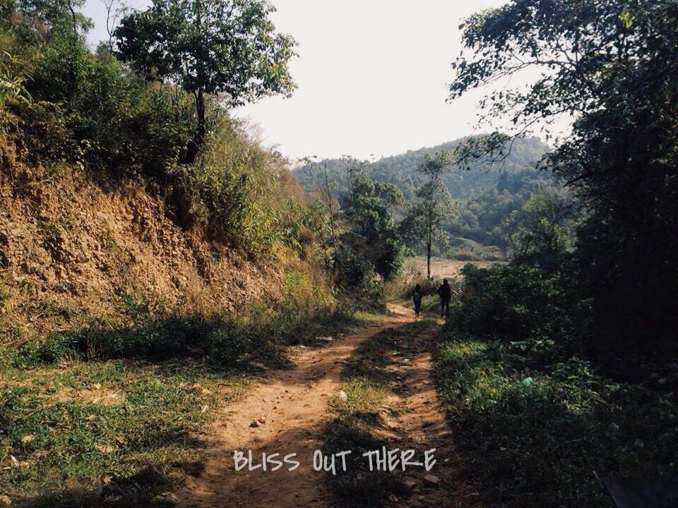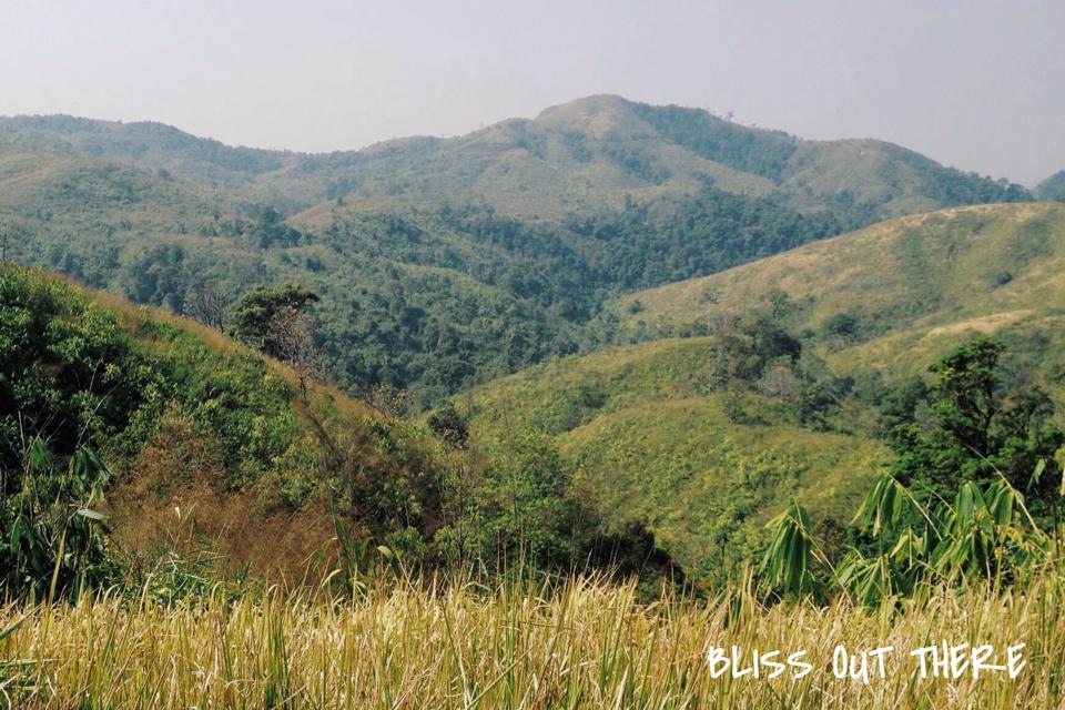 ทางจากหมู่บ้านไปจุดพักแรก ยังไม่มีอะไรมากค่ะ ยังชิลอยู่ พื้นราบปกติ มีร่องบ้างมีนูนบ้างเป็นธรรมดาของพื้นในป่า แต่สิ่งที่เรารับรู้ได้ตั้งแต่ช่วงแรกเลยคือแดดค่ะ แดดมันเป็นแดดจริงๆ คือร้อนมาก… เขา ช้างเผือกถ้าไปต้นฤดูอากาศจะหนาวและภูเขาก็จะเป็นสีเขียวขจี ส่วนช่วงปลายฤดูที่เราไปก็จะร้อนแบบนี้และภูเขาก็จะเป็นสีเหลืองทองอร่าม แต่ถึงจะร้อนยังไงเราก็ยังแนะนำให้ใส่ขายาว เพราะมันจะช่วยป้องกันรอยขีดข่วนได้ ยิ่งขึ้นไปเรื่อยๆทางจะยากขึ้น แต่วิวก็จะสวยขึ้นเรื่อยๆด้วยค่ะ ตอนเดินก็จะเจอคนที่ขึ้นเขาเมื่อวานกำลังลงจากเขาค่ะ เดินสวนปุ๊ป “สู้ๆนะน้อง” “ไปให้ถึงนะคะ” “นี่ยังสวยไม่ถึง5%ของข้างบนเลยครับ” แหมะ พวกนายจะคูลกันไปไหน เดี๋ยวพรุ่งนี้จะขอพูดอะไรคูลๆแบบนี้มั่งคอยดู… หลังจากผ่านจุดแรกที่ต้องใช้เชือกพยุงตัวขึ้นมาได้ เราก็จะถึง “จุดพักต้นส้าน”ค่ะ สวยงามใช้ได้ มองลงไปเห็นหมู่บ้านปิล๊อกล้อมด้วยหุบเขา นั่งพักกันสักหน่อยแล้วเดี๋ยวลุยกันต่อ