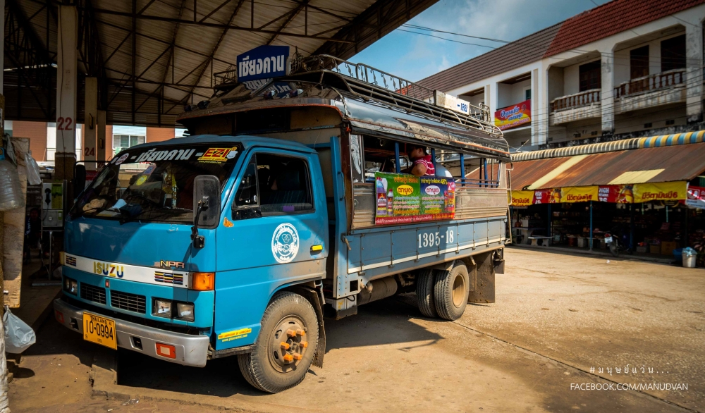 นั่งรถเกือบ ๆ 3 ชั่วโมงครึ่งเราก็มาถึง บขส จ.เลย เราต้องต่อรถสองแถวไปยังเชียงคาน โดยรถสองแถวสีฟ้า จะจอดอยู่ด้านหลังบขส