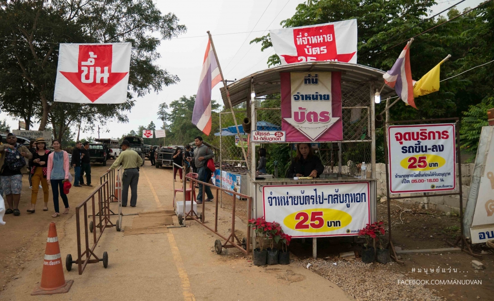 เมื่อถึงที่ภูทอก เราจะต้องโดยสารรถกระบะสองแถวขึ้นไปที่ยอดภู ค่าโดยสาร 25 บาทต่อคน