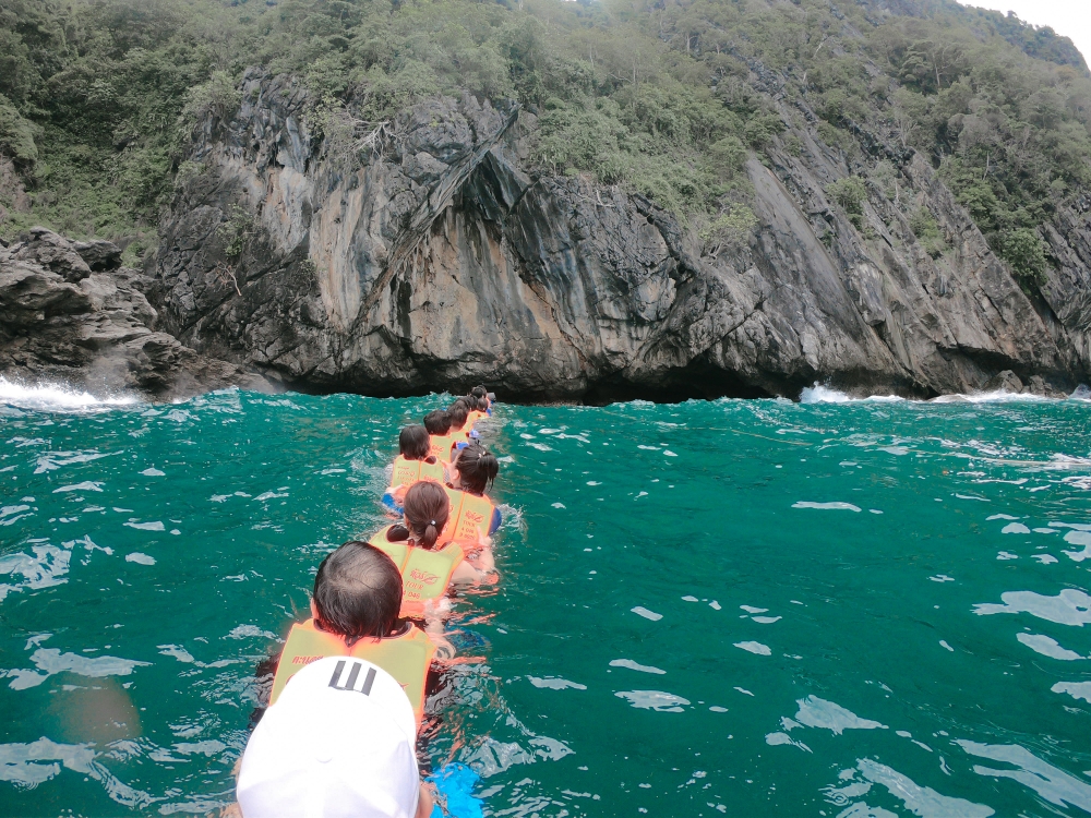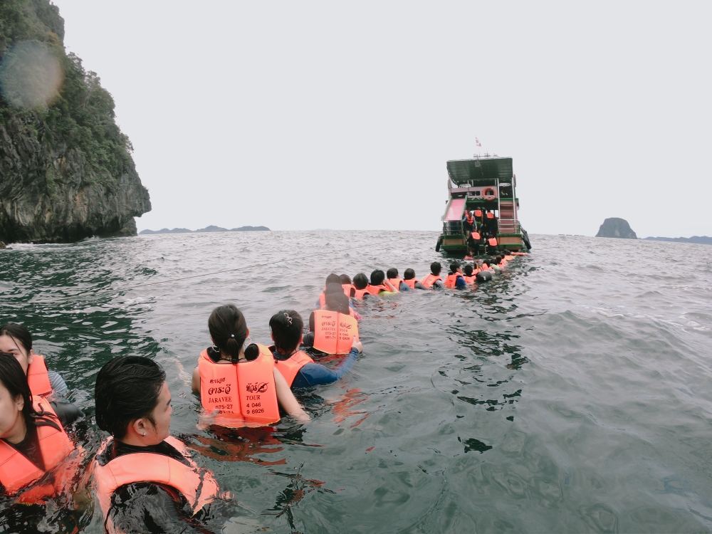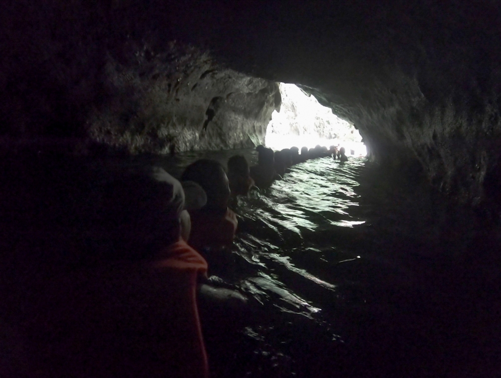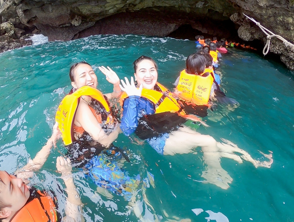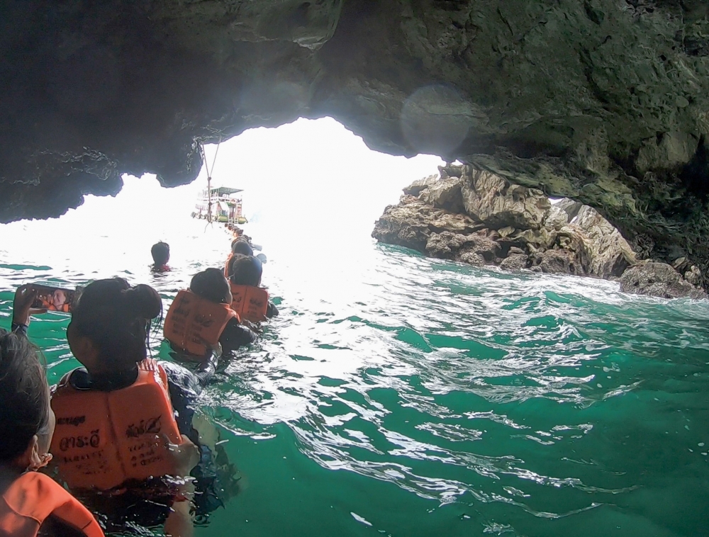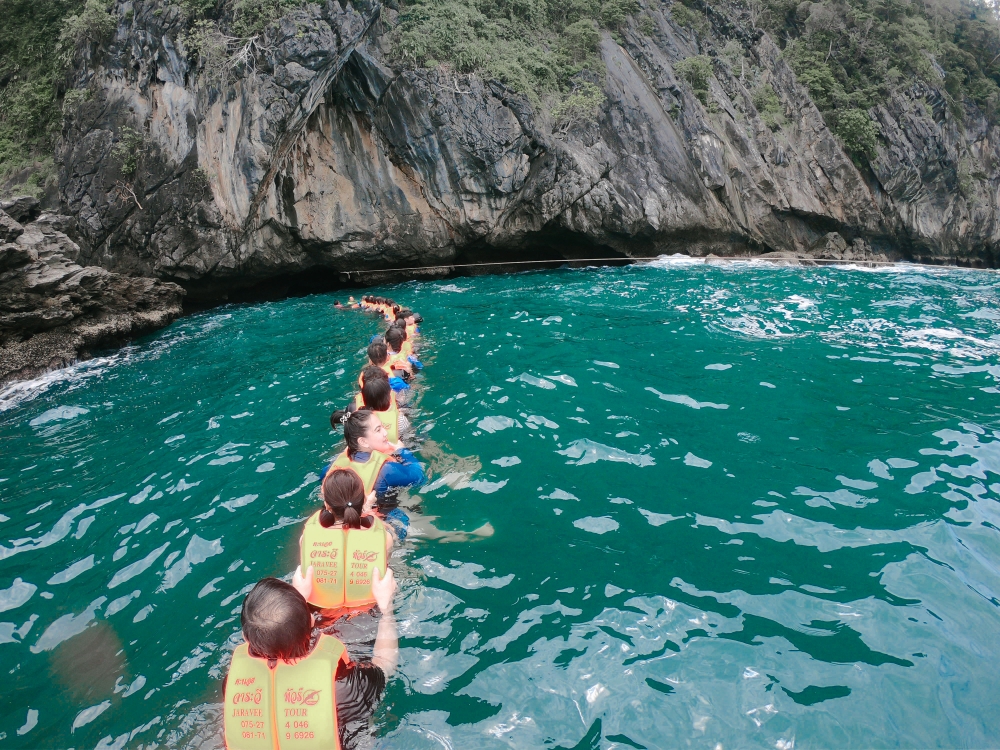 ต่อแถวเรียงหนึ่งกันเข้าถ้ำมรกรต วันนี้คลื่นแรงมากๆเข้ายากนิดเพราะคลื่นซัดลอยตัวยาก