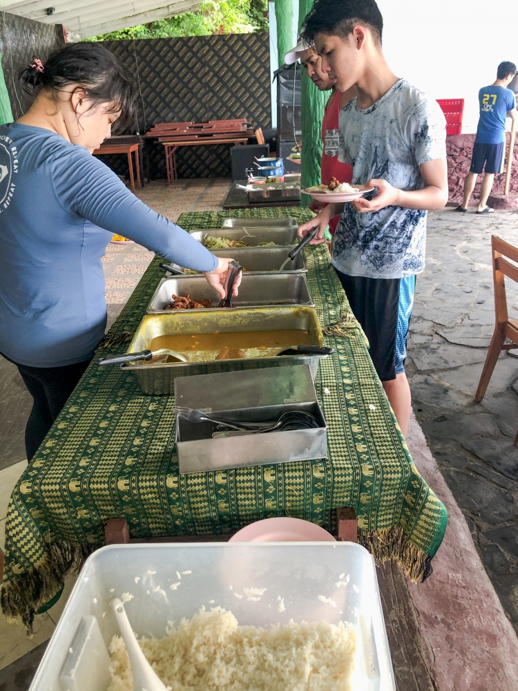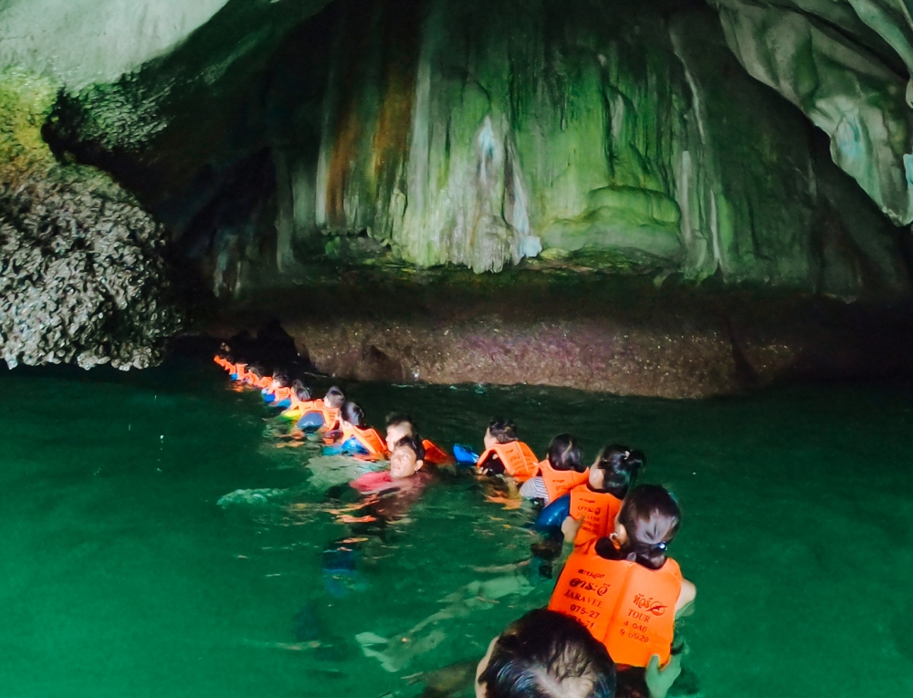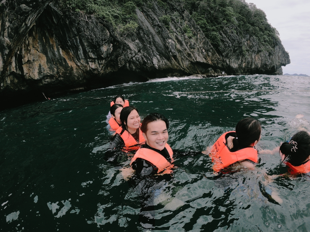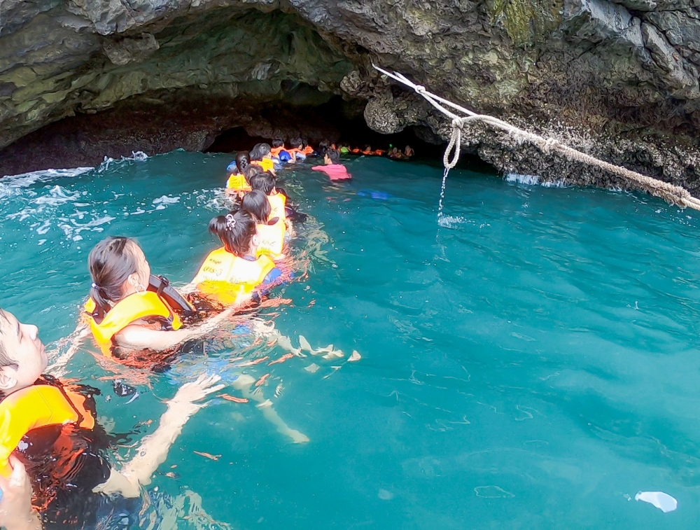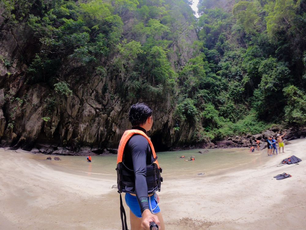 ต่อแถวเรียงหนึ่งกันเข้าถ้ำมรกรต วันนี้คลื่นแรงมากๆเข้ายากนิดเพราะคลื่นซัดลอยตัวยาก