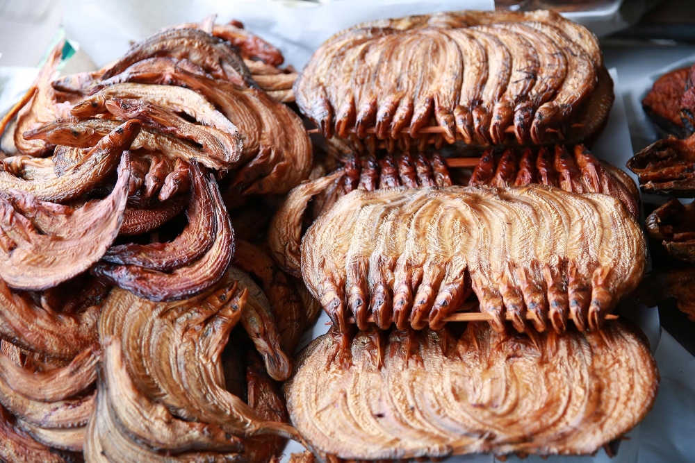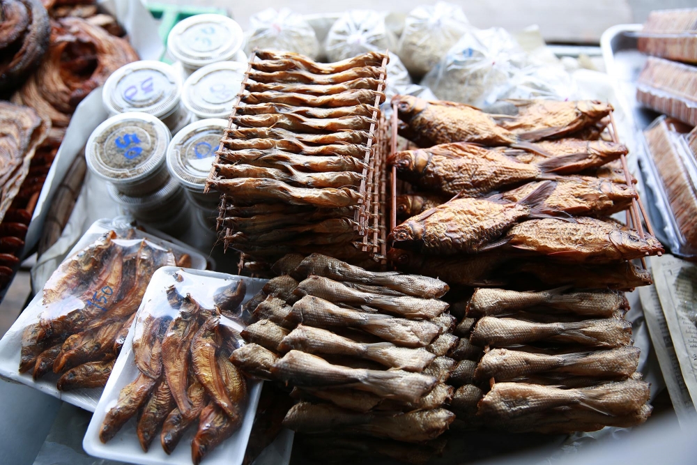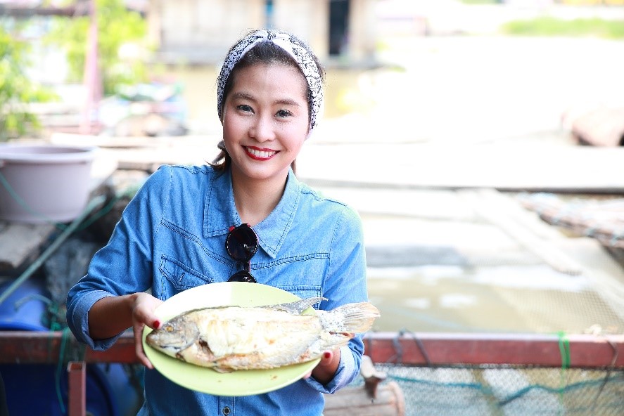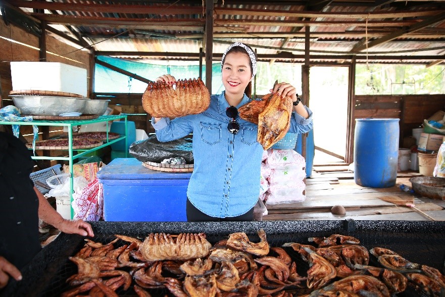 กลิ่นปลาย่างหอมๆ ร้องเรียกให้เราต้องแวะขึ้นไปดู พอก้าวเท้าขึ้นแพ ก็เห็นป้าแต๋วกำลังย่างปลาอยู่เต็มเตาเลยค่ะ หอมน่าทานมาก มีปลาหลายชนิดให้เลือก ทั้งปลาสวาย ปลาเนื้ออ่อน และปลากด ป้าแต๋วบอกว่าปลาแห้งพวกนี้เอาไปทำต้มโครงปลากรอบอร่อยนักแล หรือจะเอาไปทำเป็นน้ำพริกปลาย่างก็ได้ค่ะ