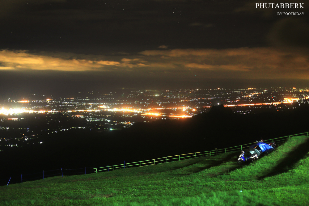 แสงไฟถนน  แสงไฟบ้านเรือนด้านล่างเห็นชัดเมื่อฟ้าเริ่มมืด